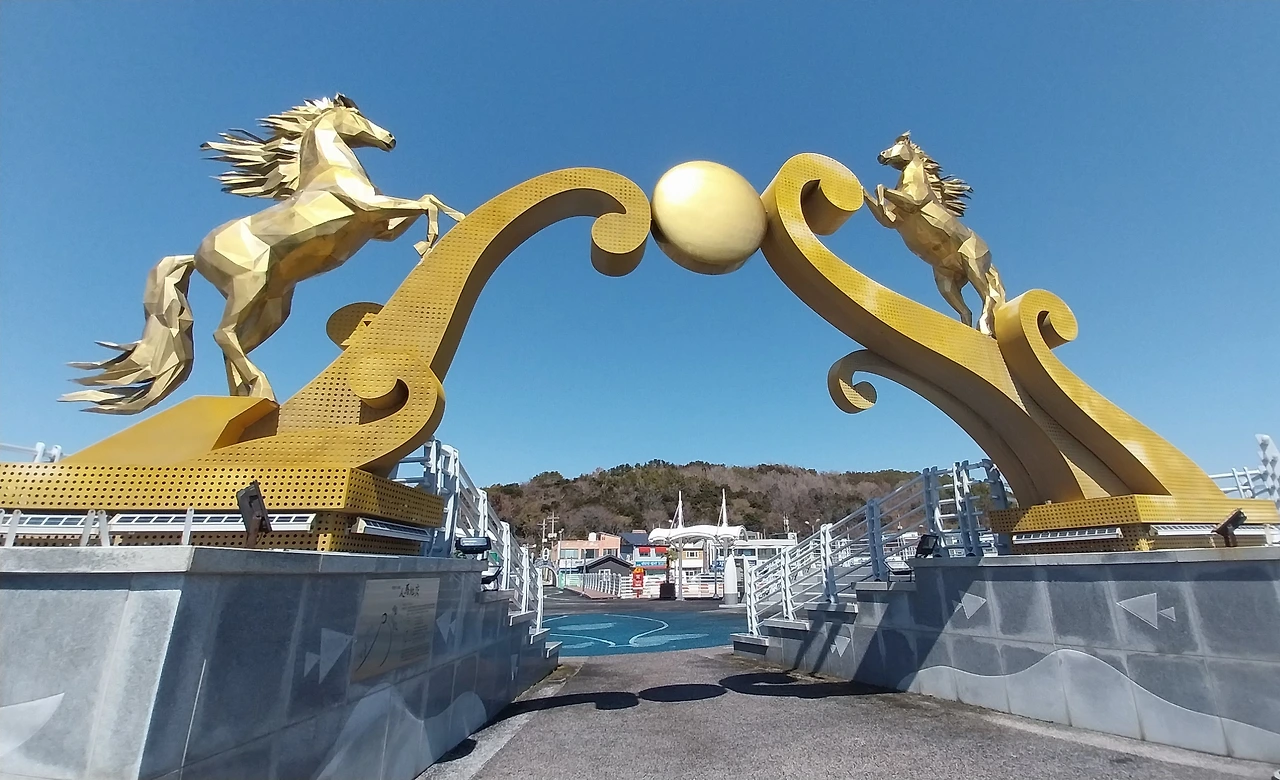 물고기 조형물 입구로 들어가자 커다란 말 두 마리가 양옆에서 뛰어오르는 모습이 멋스럽다