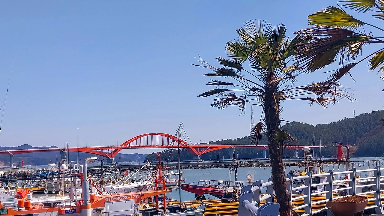 배들이 즐비한 항구 저 멀리에 빨간 다리가 선명하게 뻗어있어 산뜻하다
