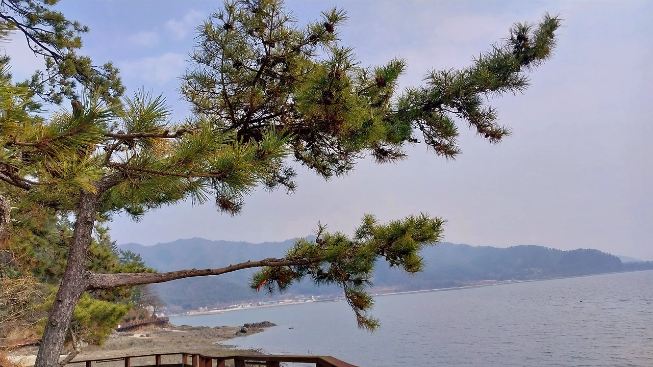 섬길을 따라가니 멋진 소나무가 어우러진 데크 길을 지나 바닷가에 가우도 비가 있는데