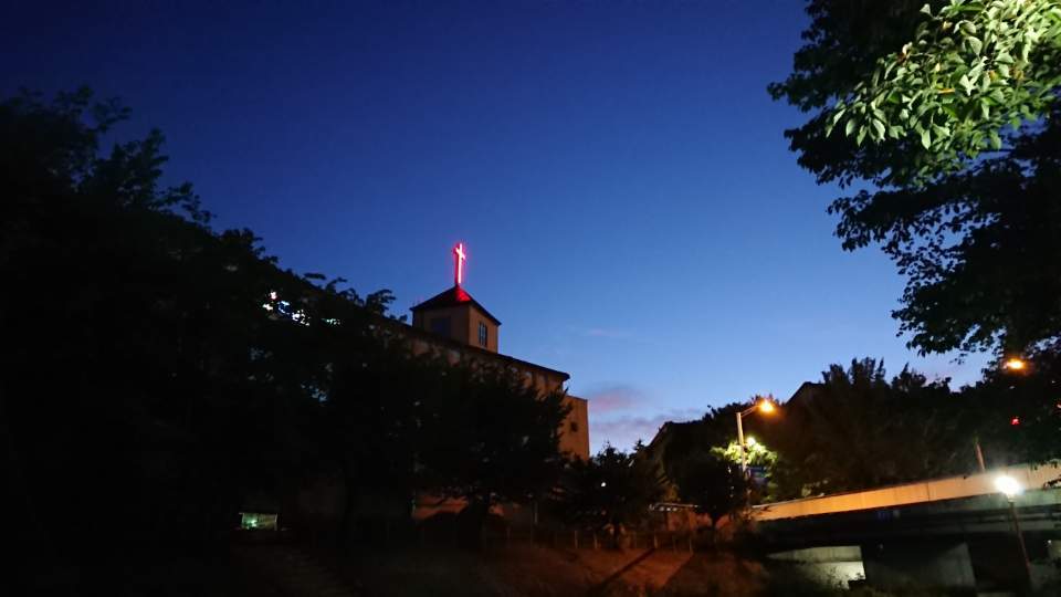 교회 지붕 빨간 십자가 하늘에 기도하는