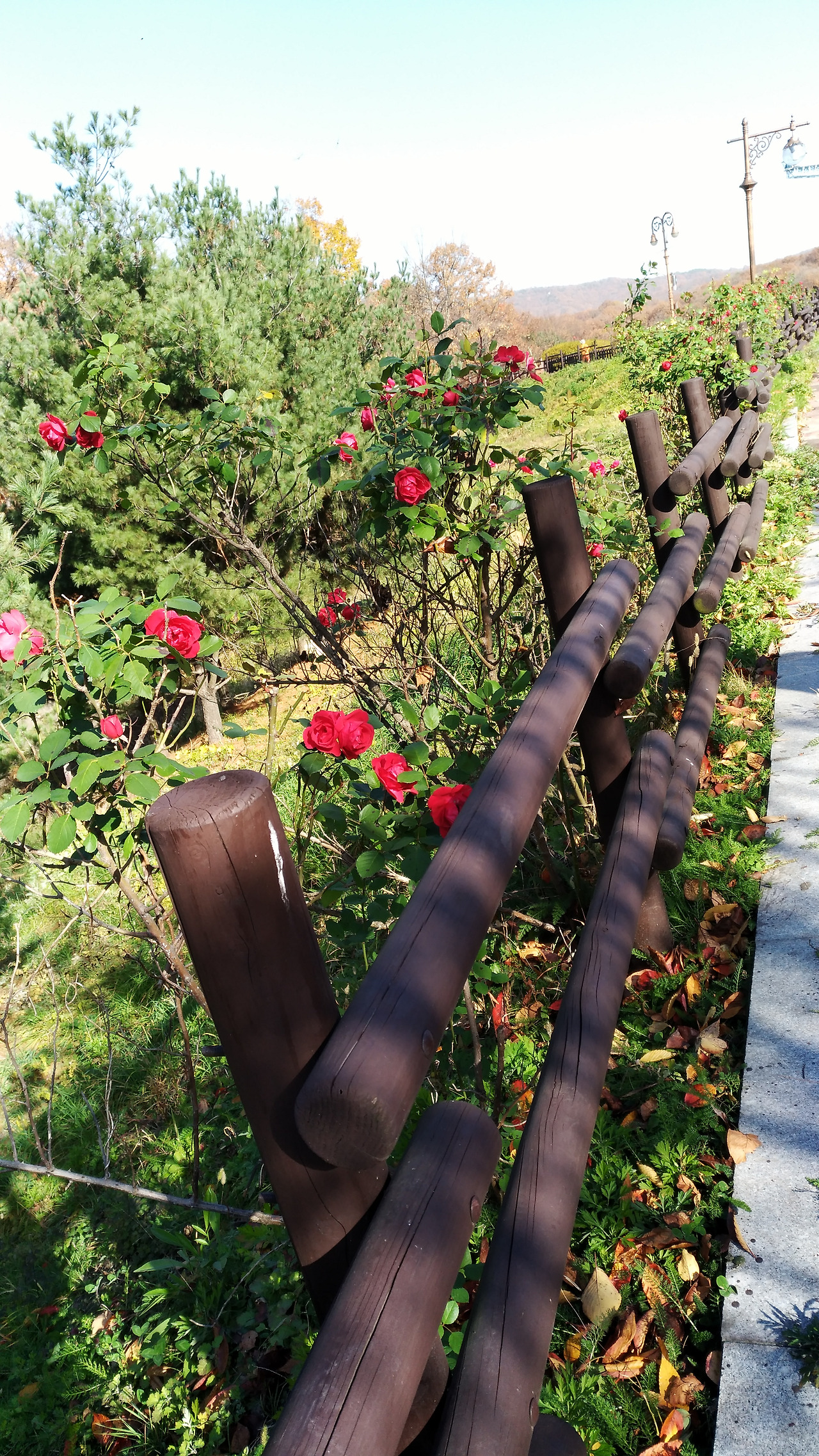 울타리에 핀 덩굴장미의 아름다움이