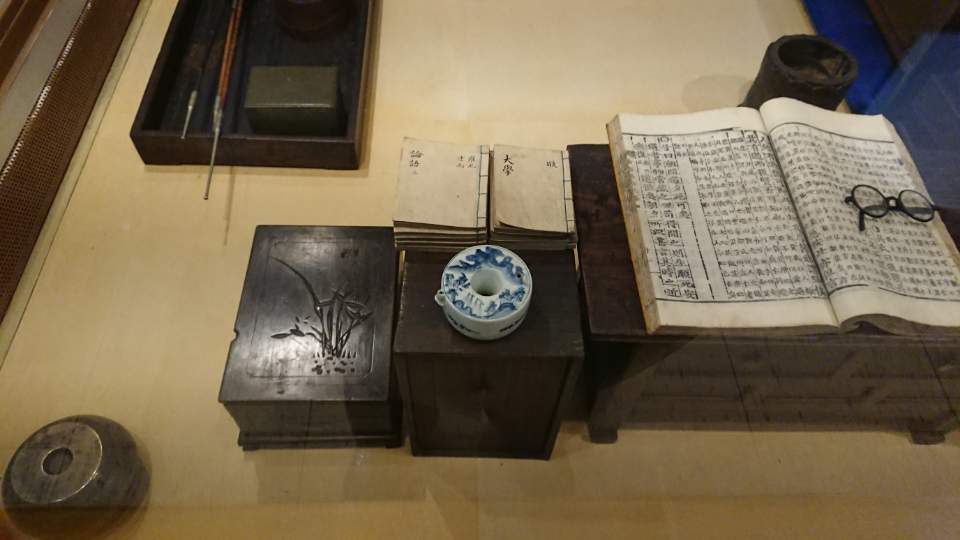 앉은뱅이 책상에 앉아 안경 코에 걸치고