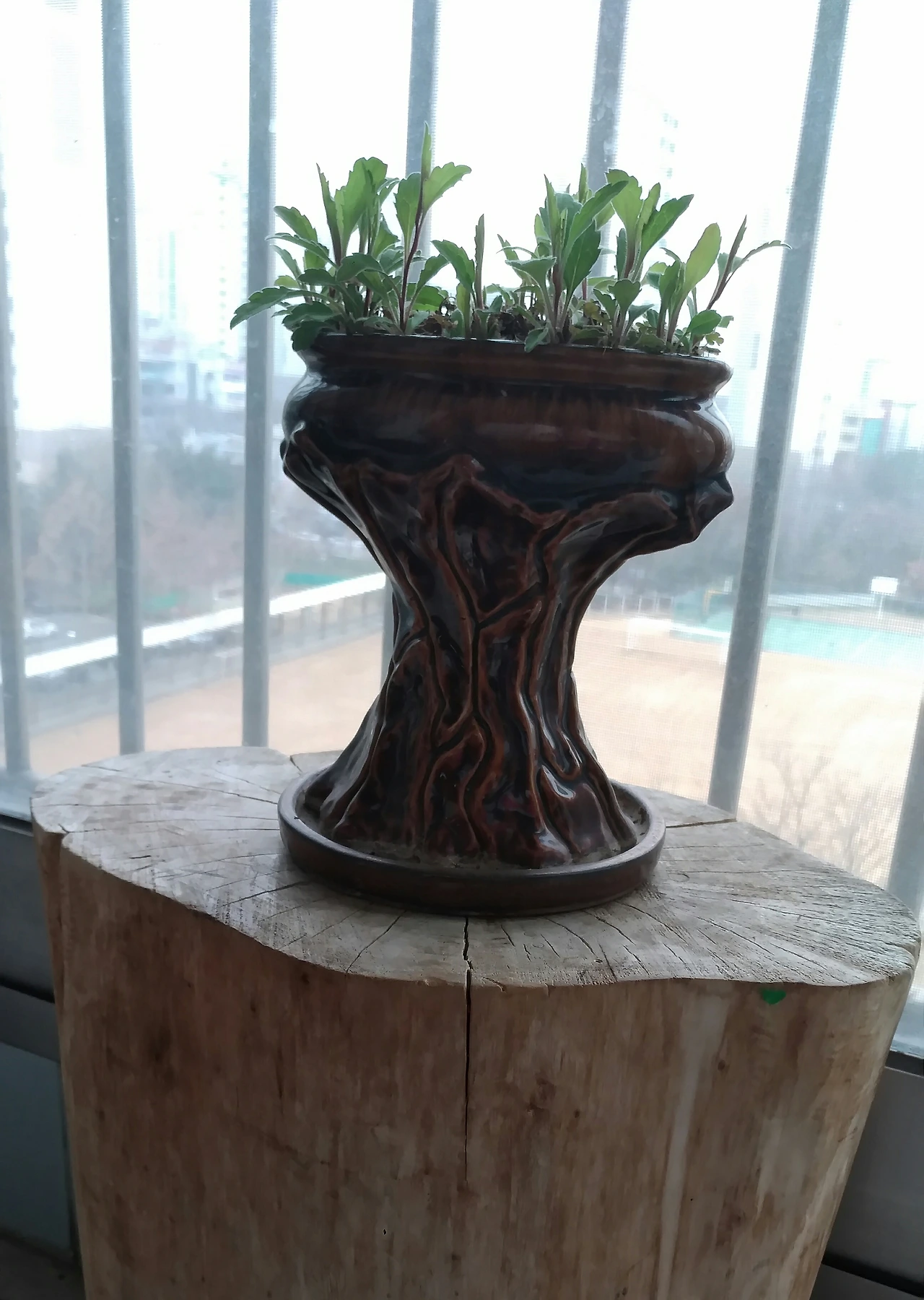 발코니 탁자 위 미니국화