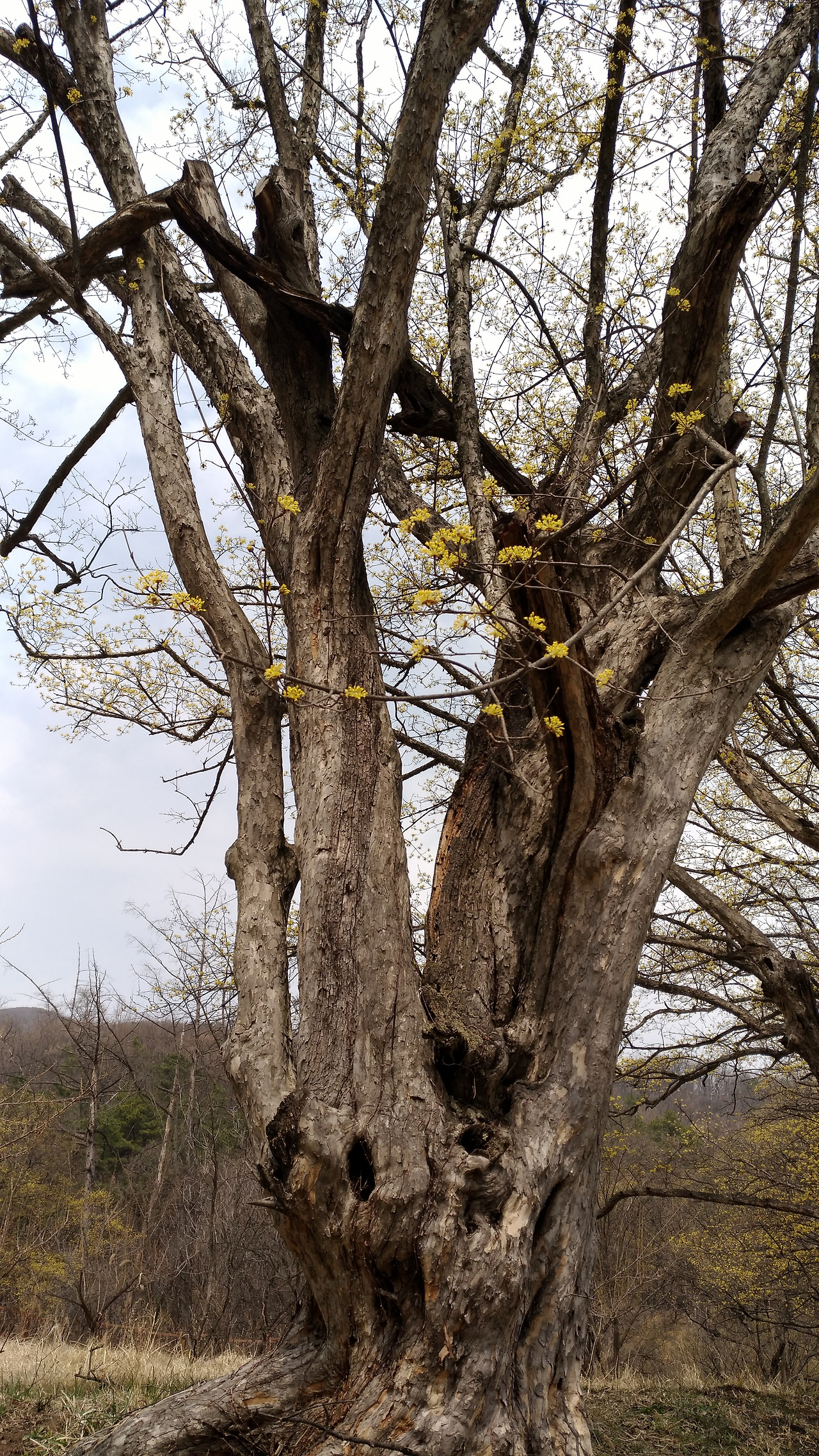 큰 고목 산수유나무 낮은 소리로