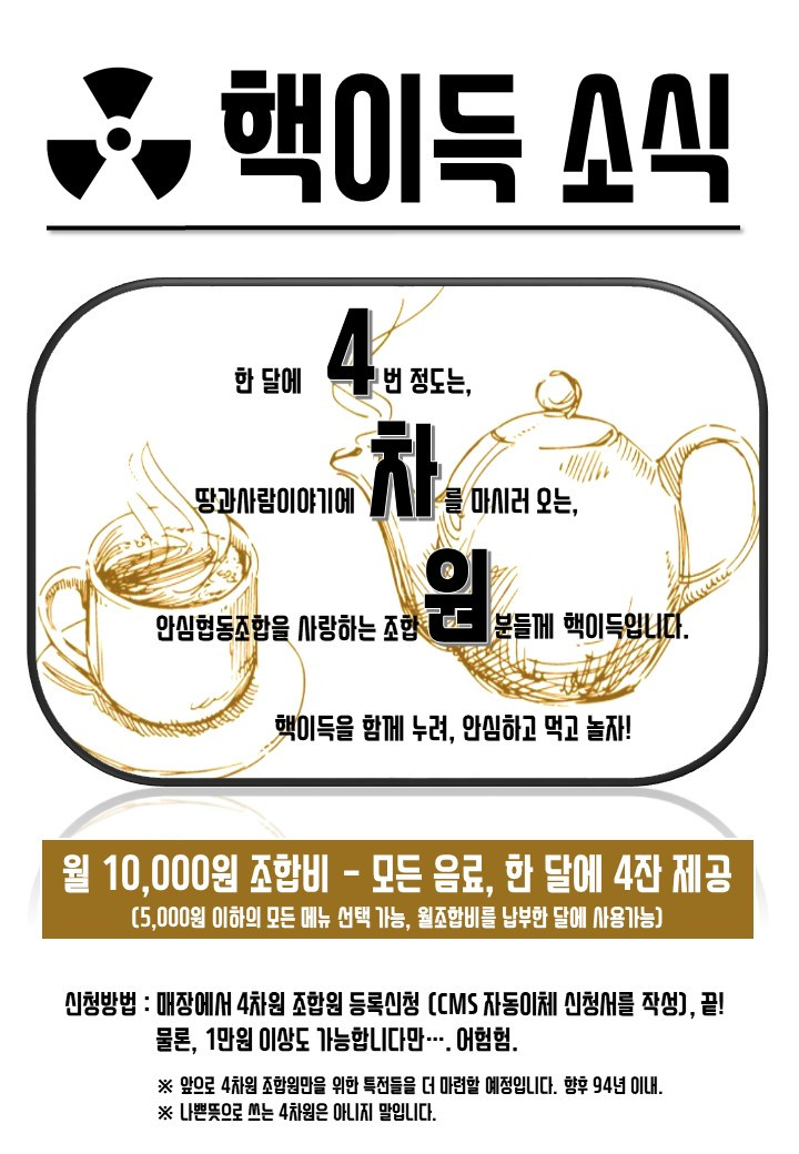 한달에 만원의 자동이체를 신청한 조합원에게 한달동안 네 잔의 차를 마실 수 있는 포인트북을 줍니다.