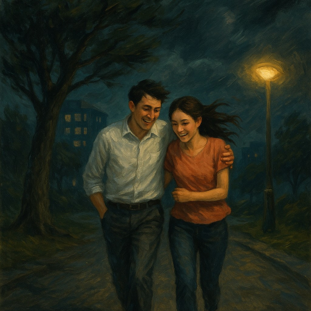 아내는 바람에 걸려 넘어지지 않으려 내 팔에 바짝 매달렸다