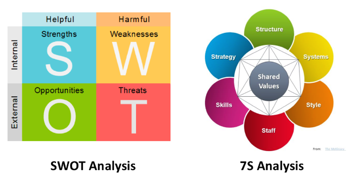 여기서 말하는 강점(Strengths), 약점(Weaknesses)은 기업 내부적인 요인들을 말한다. 또 기회(Opportunities)와 위협(Threats)은 외부 환경 하에 우리 회사가 처해있는 상황이다. 이 간단한 4분면 위에 현재 기업이 맞닥뜨리고 있는 상황과 내부 역량들을 하나하나 채워가다 보면 신기한 점을 발견하게 되는데, 그 분석의 결과가 이를 수행한 사람에 따라 사뭇 다르게 나타나기 때문이다. 어떤 사람은 A라는 회사가 가진 역량을 강점으로 보기도 하고, 또 다른 사람은 약점으로 보기도 한다. 또 정부 제도나 시책의 변화를 기회로 보는 사람이 있는가 하면, 이를 위협으로 보는 사람도 있다. 한 걸음 더 나아가 경쟁자들의 전략, 뿐만 아니라 완전히 생각지도 못한 다른 산업군에 있는 기업들의 움직임을 외부 요인에 넣어 고려하는 사람이 있는가 하면, 전혀 그런 것들은 고려하지 않고 순수히 기업을 둘러싼 단일 마켓/산업 만을 고려하는 분석가들도 있다.