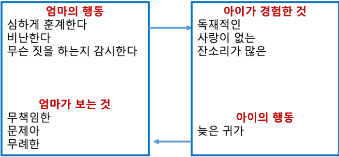 책에는 한 엄마와 청소년 아이의 귀가 시간에 대한 문제를 다룬다. 아이가 늦게 들어오는 것이 못마땅한 엄마가 아이에게 잔소리를 늘어놓는다. 통금시간도 정해보고 나름의 룰도 정해 둔다. 늦은 행동이 계속되는데 대한 못마땅에 엄마의 비난과 목소리는 커져간다. 아이의 반항도 그만큼 커진다. 그러던 어느 날, 아이가 저녁 약속을 나간다고 하고, 엄마는 10시까지 들어오라 신신당부한다. 집에서 TV를 보고 있던 엄마는 9시 55분 어떤 생각을 하고 있을까? 이 사례의 반전과 재미는 여기서 시작했다. 아이가 9시 59분에 딱 맞추어 귀가해 버린 상황을 맞닥뜨린 엄마의 감정 말이다. 그간 엄마와 아이가 관찰하고 경험한 내용은 아래와 같다. 통상 인간의 행동은 꽤 일관성이 있기 때문이다.