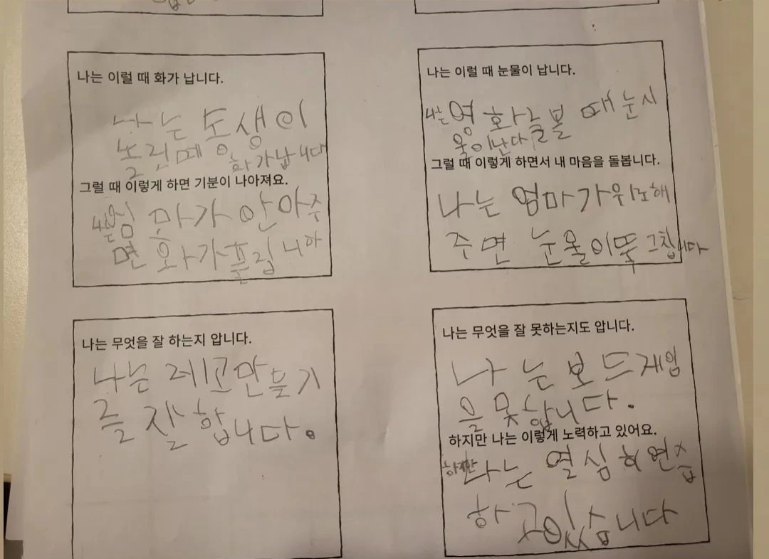 어느 날, 아이의 책가방을 정리하면서 아이의 활동지가 나왔다. 거기엔 아이가 언제 화가 나는지, 무엇을 좋아하고 못하는지 아이의 생각이 적혀있었다.