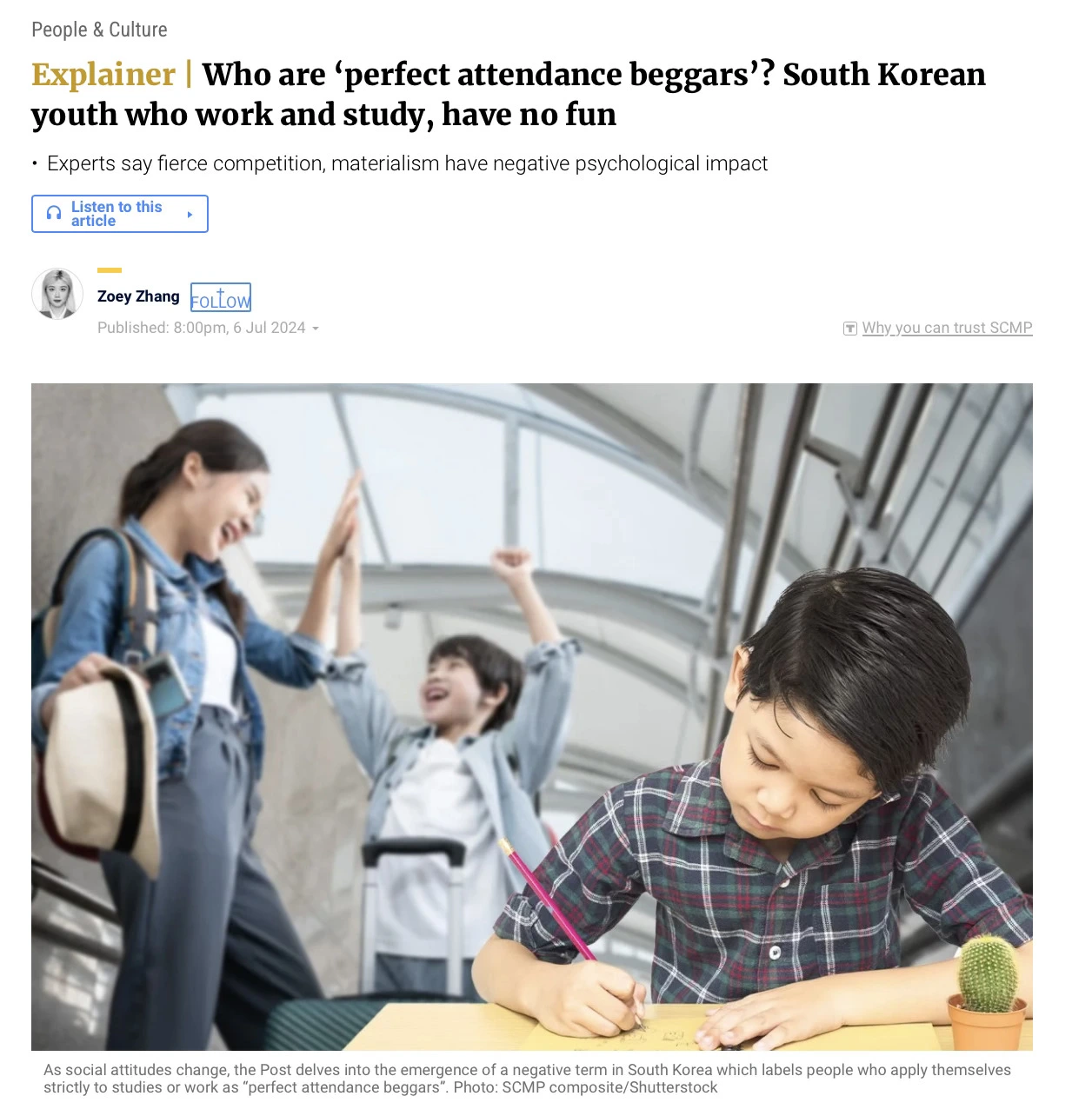"A new term, 'perfect attendance beggar,' has emerged in South Korea to derogatorily refer to elementary school students as 'poor' for consistently attending school without going on overseas trips during the semester."