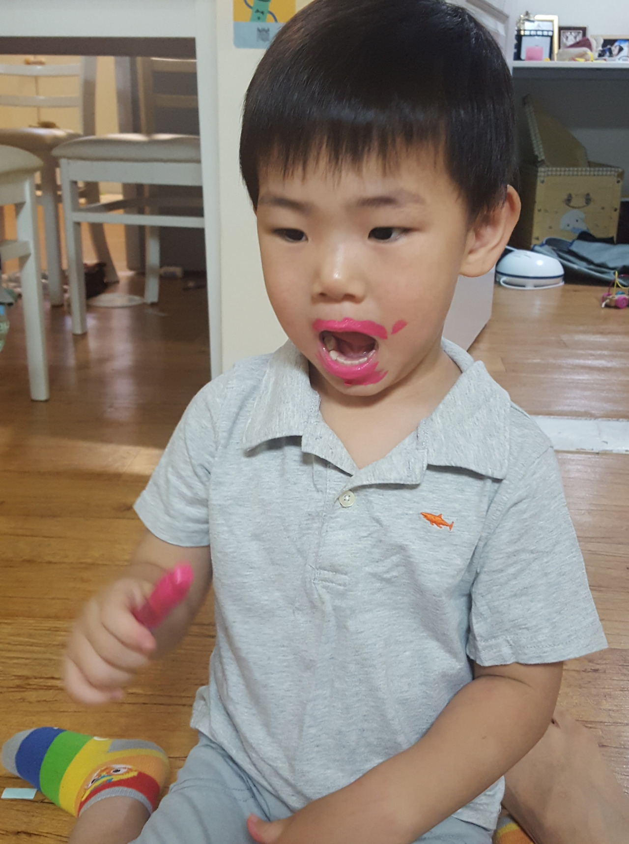 내 화장대에 화장품들로 립스틱은 크레파스 삼고, 파운데이션 팩트는 찍는 물감 삼고, 방 전체를 도화지 삼아 예술가 재능을 마음껏 펼치던 아이.