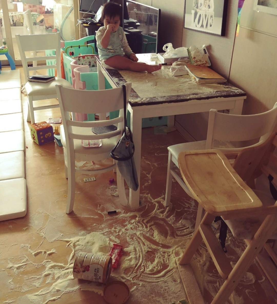 분유 한 통을 모두 쏟아서 모래밭처럼 만들어 놓고 그 위에서 분유를 퍼먹던 첫째 아이.