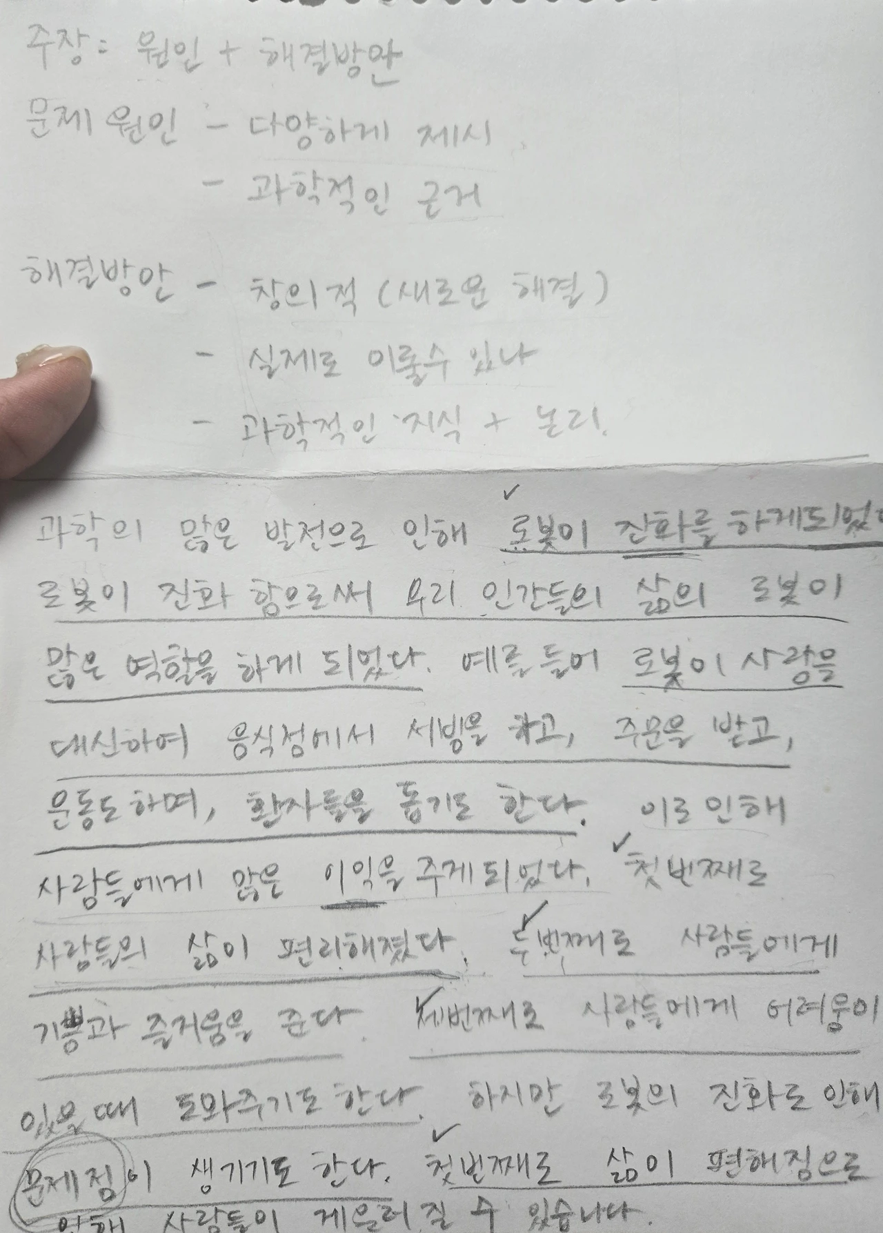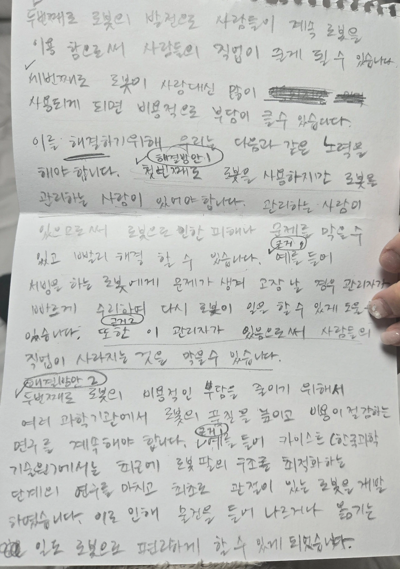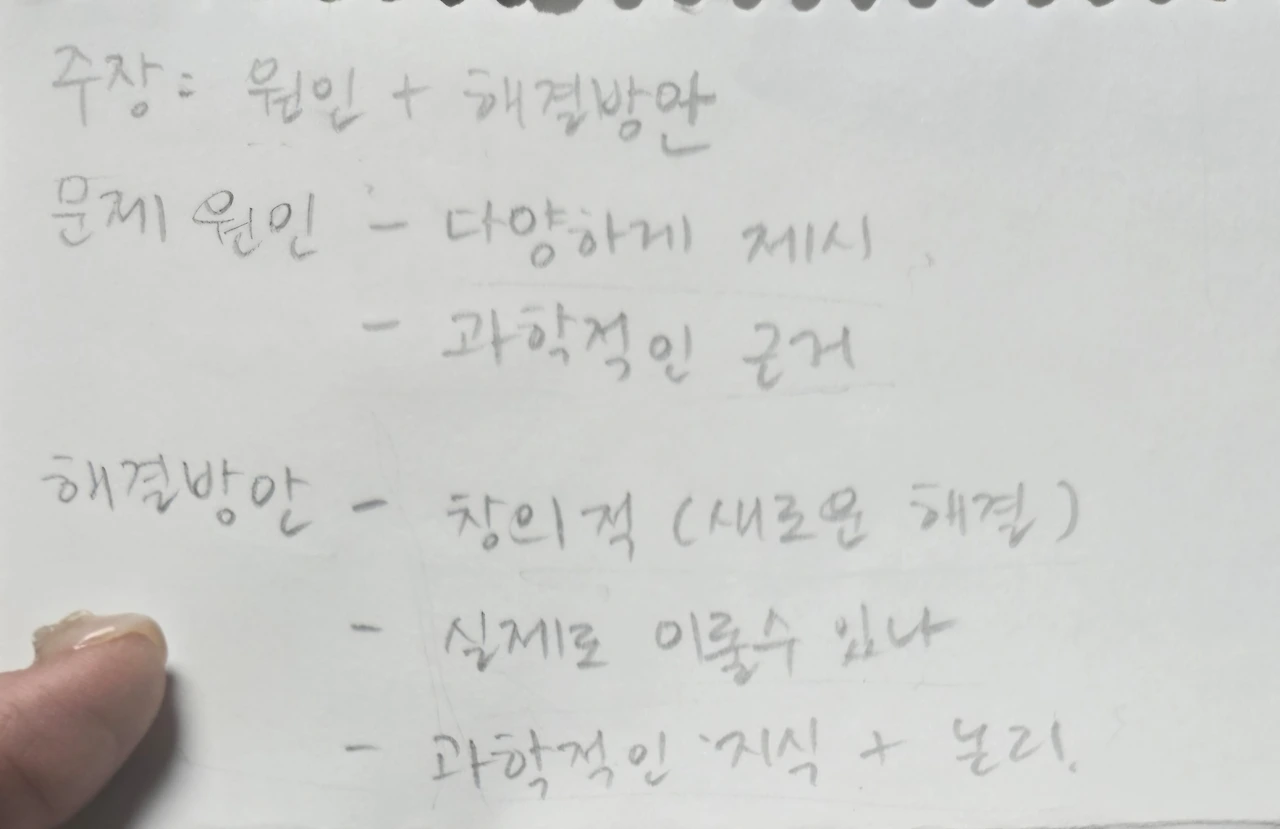 하지만 우리에게는 시간이 너무나도 부족했다. 어쩔 수 없다. 나는 아이와 나눈 이야기들을 토대로 빠르고 간단하게 토론서의 뼈대를 작성하기 시작했다. 그리고 아이에게 계속 읽고 숙지하여 '주제-소주제-해결방안1-근거-해결방안2-근거' 이런 형식대로 글을 쓰고 밑줄 친 부분만 주제에 맞게 바꾸어 작성하라고 했다.