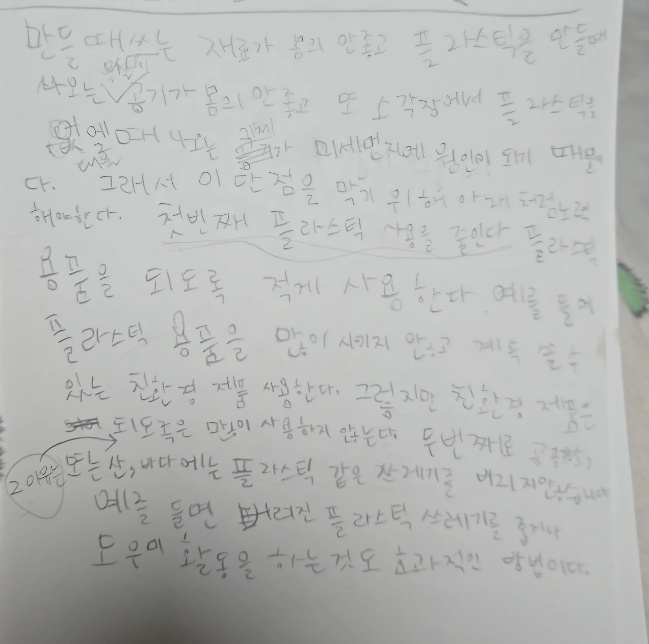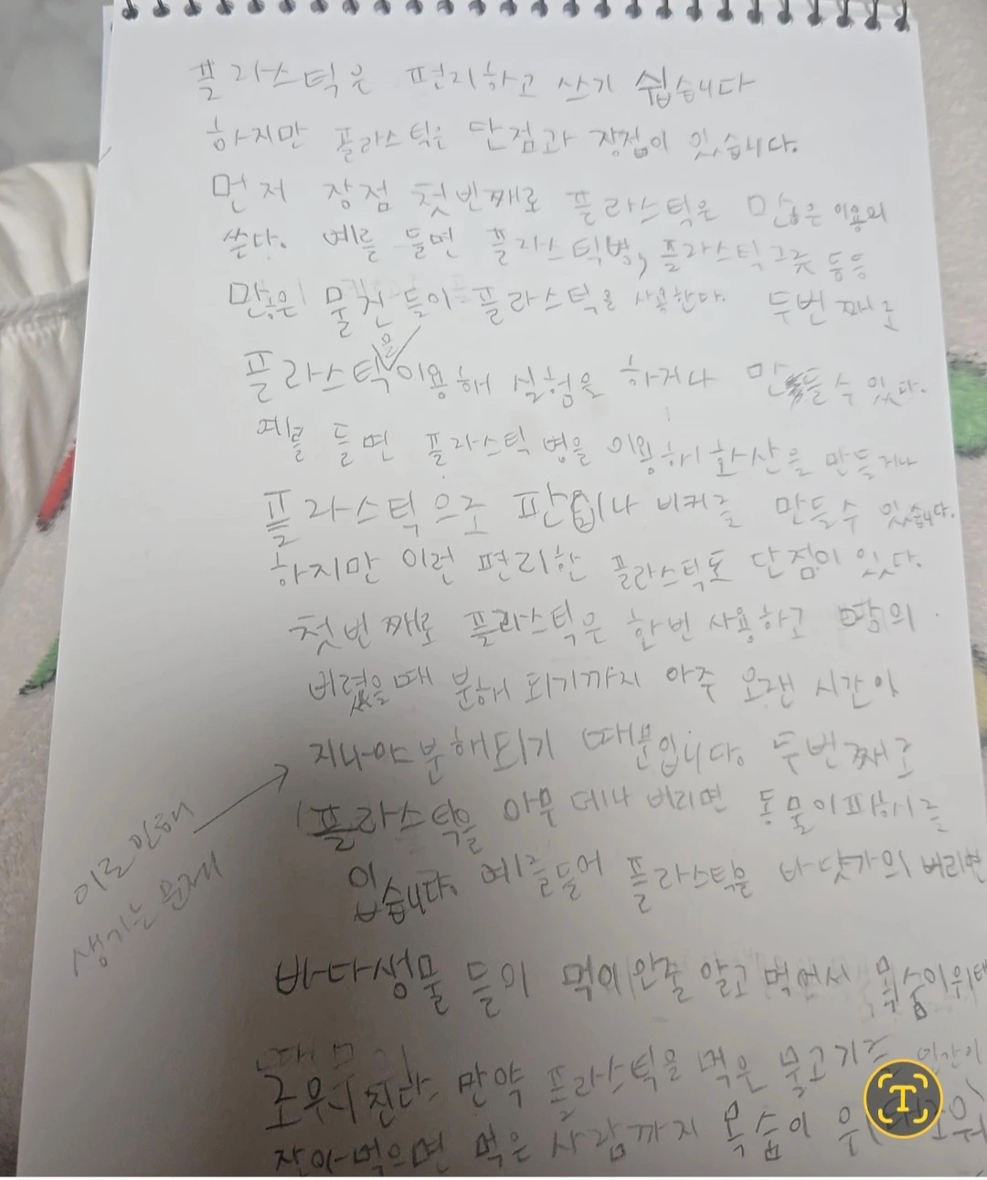 둘째 날은 내가 작성한 예시 토론서 처럼 다른 주제에 맞게 작성해 보도록 했다. 주제는 플라스틱 이용의 장점과 단점. 생각보다 쉬운 주제였지만 전날과는 비교도 할 수 없게 발전한 아이였다. 한 문장도 쓰지 못해 쩔쩔매던 아이는 내가 짜준 토론서의 뼈대를 생각하며 자신의 생각을 적어나갔고 20분 만에 두 페이지의 공책을 꽉 채웠다. 맞춤법도 틀리고 삐뚤빼뚤한 글씨였지만 무엇보다 중요한 것은 전날과는 비교도 할 수 없게 달라진 아이의 태도였다.