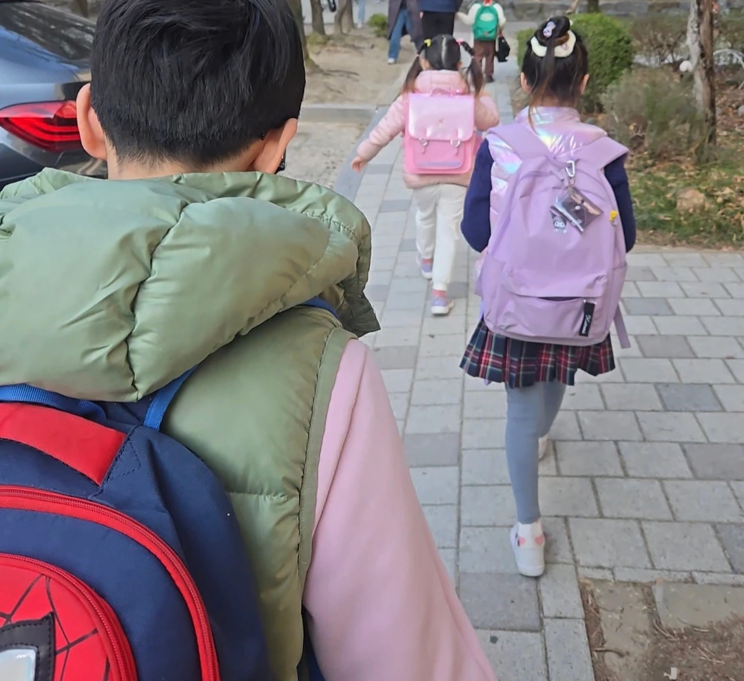 어찌어찌해서 셋째도 초등학교 1학년이 된 지 3주 차가 된 요즘. 전보다 30분 더 일찍 일어나서 아이들을 깨우고 간단하게 아침식사를 챙겨주고 등교 길에 나선다.