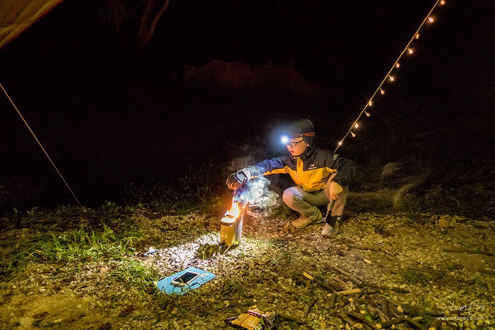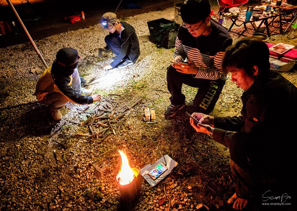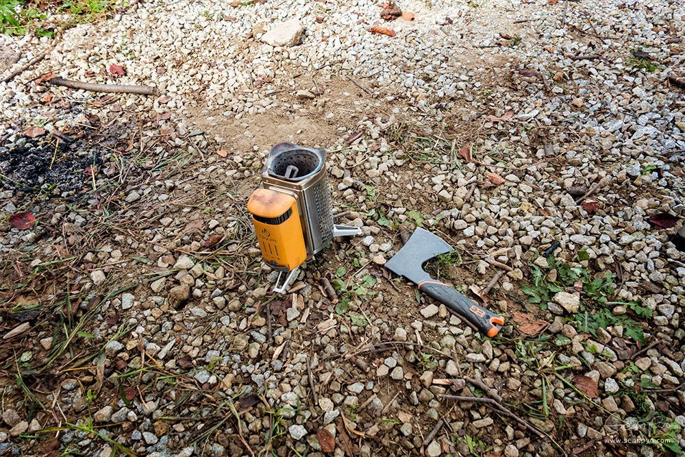 본격적인 불장난의 시간, 아직은 추운 계절이 아니라 작은 화로대에 모닥불을 피웁니다. 바이오라이트 캠프 스토브는 열에너지를 전기로 바꿔 전자기기를 충전할 수 있습니다. 배터리가 떨어져 가는 스마트폰을 살리기 위해 열심히 나무를 넣습니다.