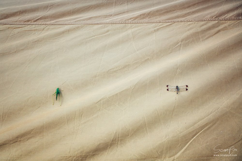 어젯밤 운 좋게도 올해 여름 몽골 여행에서 보다 더 많은 시간 별을 보았습니다. 술도 마시고 별도 보다가 늦은 시간 잠을 잤는데도 이른 시간에 눈이 떠졌습니다. 타프 스킨에 나란히 붙어 잠든 여치와 잠자리.