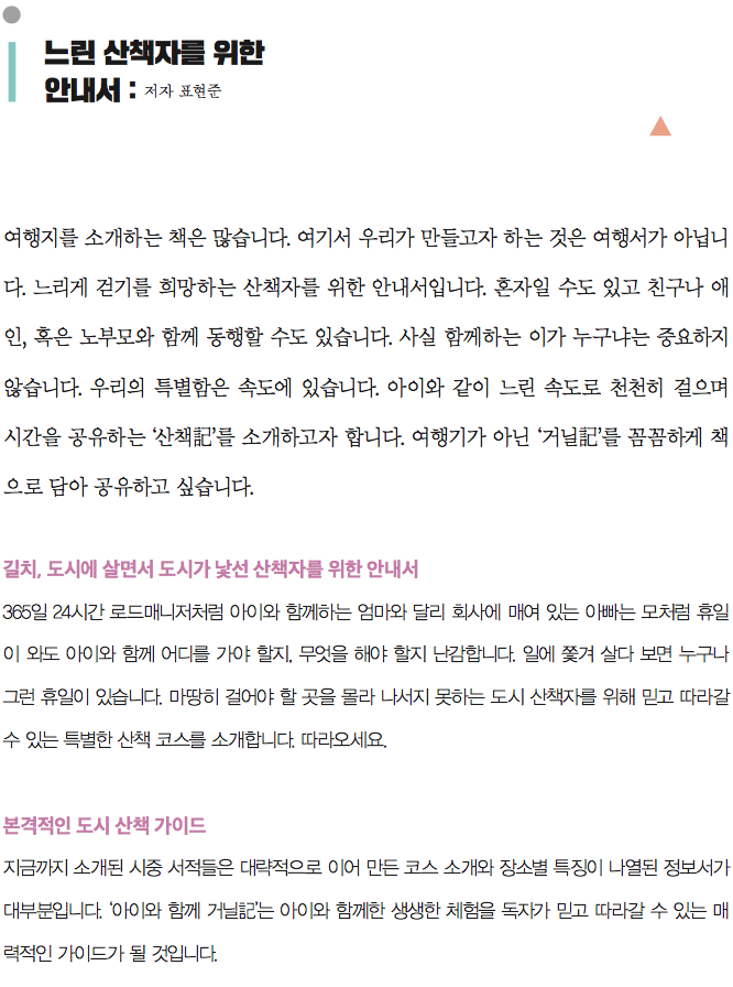 이 책의 가장 큰 특징은 저자가 추천하는 산책 코스입니다. 소개된 코스는 지난 2년간의 제작기간 동안에만 여러 번 다니며 고쳐 쓰고 다듬었습니다. 이미 알려진 유명한 코스도 있지만 아이와 함께 발자국을 새기며 검증한 소중한 루트들입니다. 아이뿐 아니라 가족, 연인들의 데이트 코스로도 추천드립니다.