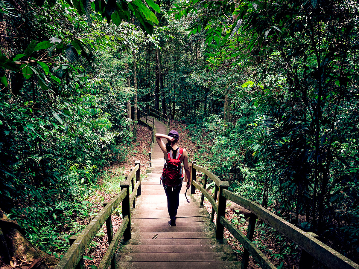깊은 숲 속으로의 트래킹이 시작되었다. 1,000개의 계단을 오르면 캐노피 워크가 있다고 한다. 이따금 만나는 햇살은 따가운데 하늘을 덮은 맹그로브 숲의 그늘 속은 시원하다. 더워도 습하지 않아 기분 좋은 땀을 흘리며 계단을 올랐다.