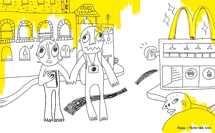 그 낯선 곳에서 발견한 맥도널드 간판은 오랜만에 만난 친구처럼 친근하게 느껴졌다. 일본이나 우리나라에는 매장 주변 빨간 유니폼을 입은 알바생(주로 여자)이 할인전단물을 나눠주지만, 몸에 딱 붙는 나시를 입고 입에 담배를 문 흑인 청년이 헤드폰으로 흘러나오는 비트를 온몸으로 시각화하며 쿠폰을 나눠주고 있었다. 그가 우리를 발견한 것은 어려운 일도 아니었다. 동양인은 우리뿐이었고 멀뚱히 서서 맥도널드와 우리 사이의 그를 바라보고 있었으므로...