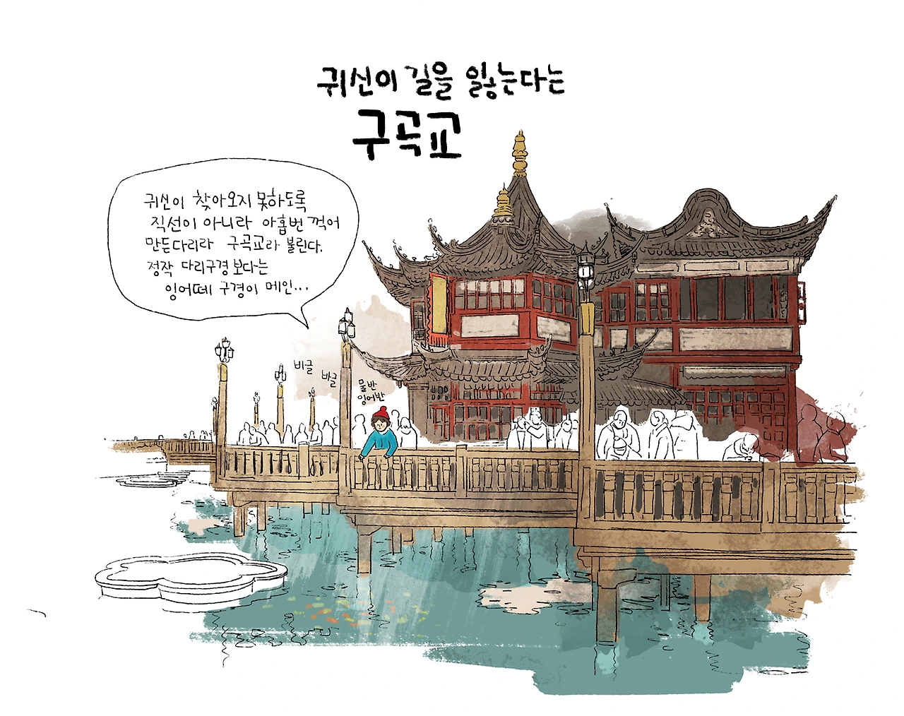 사람이 정말 많지만 대국의 너그러운 어우러짐의 풍경을 마주하는 새로움이 있다. 오래된 정원의 아름다움에 대한 소문을 듣고 왔다면, 30위안을 꺼내고 입장료를 끊고, 예원 깊숙이 들어가면 된다. 그 입구는 물 위의 아홉 번 꺾인 다리, 구곡교를 지나가면 닿을 수 있다.