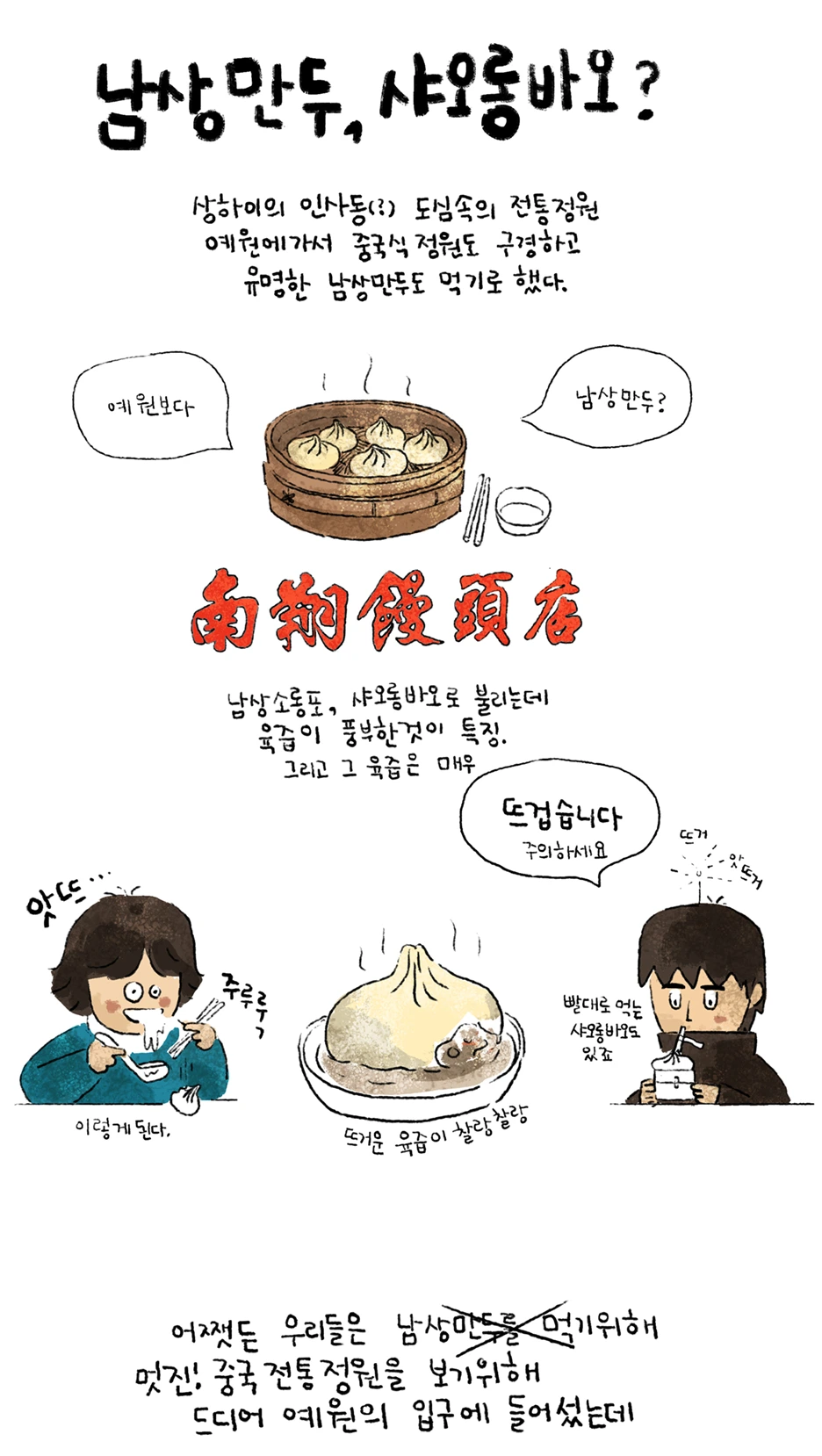 알차게 예원 깊숙한 곳을 샅샅이 훑고 나서 나오니, 출출함이 번졌다. 일행 모두 같은 마음이었는지, 발은 자연스레 음식 냄새를 따라갔다. 뭘 먹을까 고민하다가 사람들이 줄을 길게 선 음식점이 있길래 가봤다.