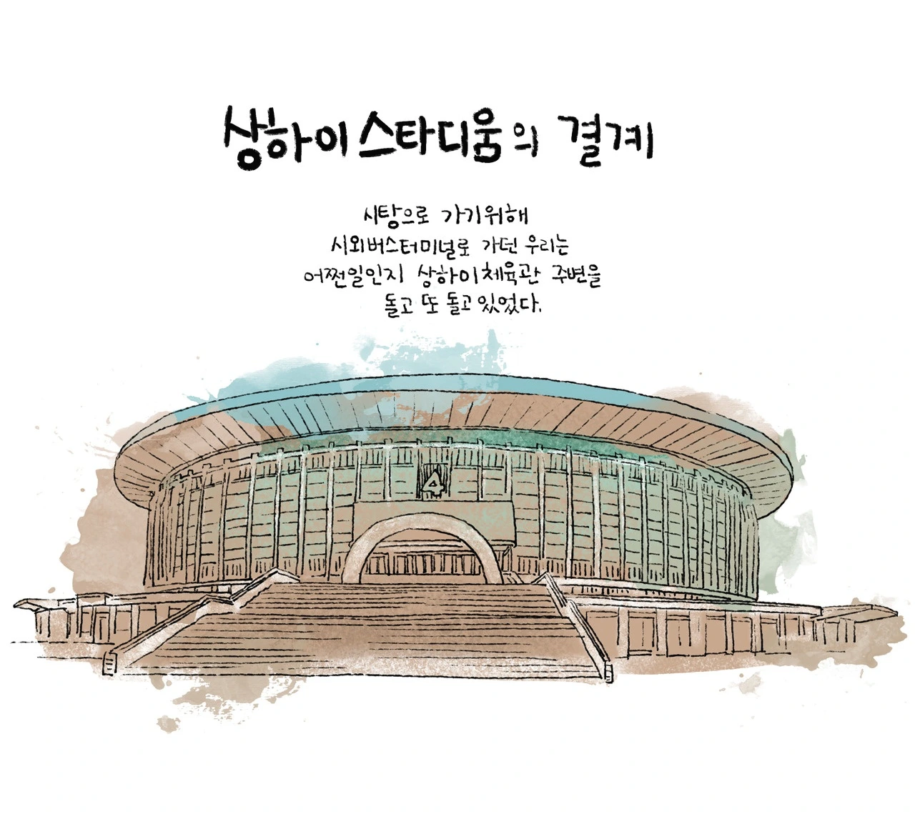 길 한 편에 놓인 독특한 그림의 나이키 광고판이 눈을 사로잡았다. 어딘가 중국스러운 느낌에 위트가 더해져 보는 재미가 있었다. 시리즈 그림을 감상하는 재미가 쏠쏠~그림의 사람처럼 경쾌하고 여유 있게 걸어서 상하이 체육관에 도착! 그런데 우리가 찾는 버스터미널은 보이지 않는다. 버스도 버스를 타려는 사람도. 규봇은 재빠르게 검색을 시작했고, 나머지는 두리번 두리번…