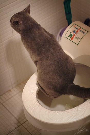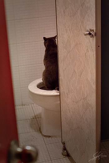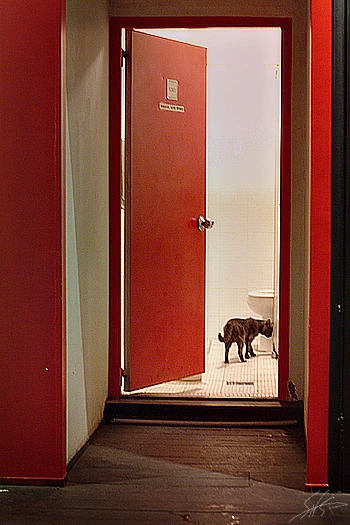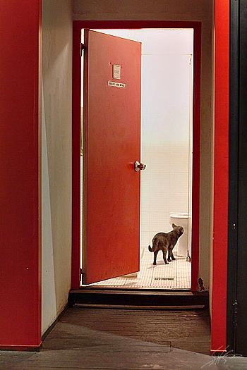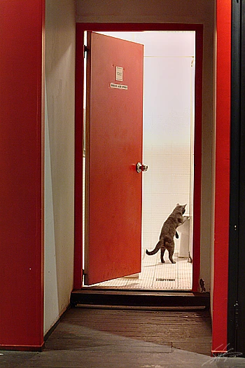 고양이는 뒤를 살피며, 반쯤 열린 문턱을 넘어