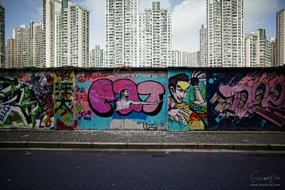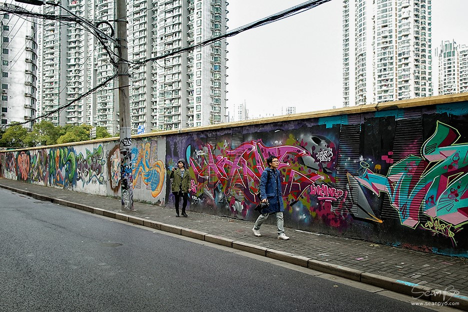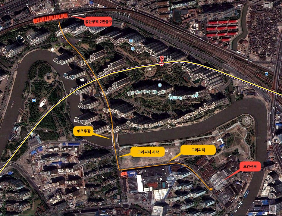 아파트 단지가 끝나는 지점에 쑤조우 강이 나오고 작은 다리를 건너서 조금 걷다 보면, 왼쪽으로 한쪽 벽에 그라피티가 길게 펼쳐진 길이 나온다. 그 길의 끝에 모간산루가 있다.