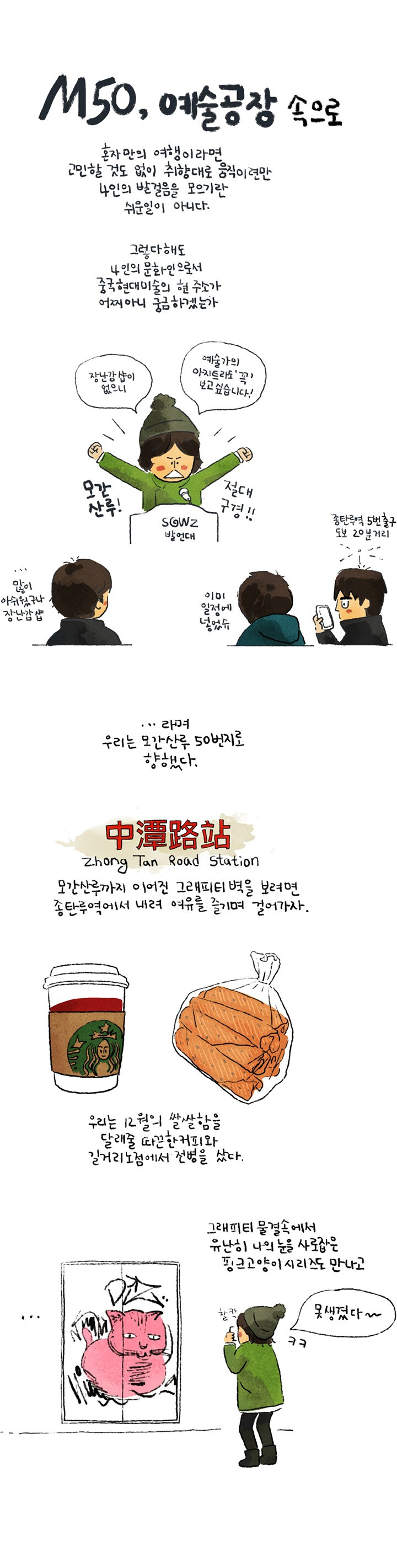 오늘의 첫번째 목적지는 중국 및 해외의 예술가들이 운영하는 갤러리와 스튜디오가 밀집해 있는 예술가 구역 ‘모간산루’다. 밖으로 나왔는데 다행히 비는 내리지 않았다. 다 쓴 미스트에서 어쩌다 튀어 나온 듯한 액체성분이 얼굴에 살짝 느껴지긴 했지만 다행히 우산이 필요한 정도는 아니었다.
