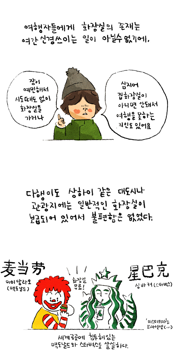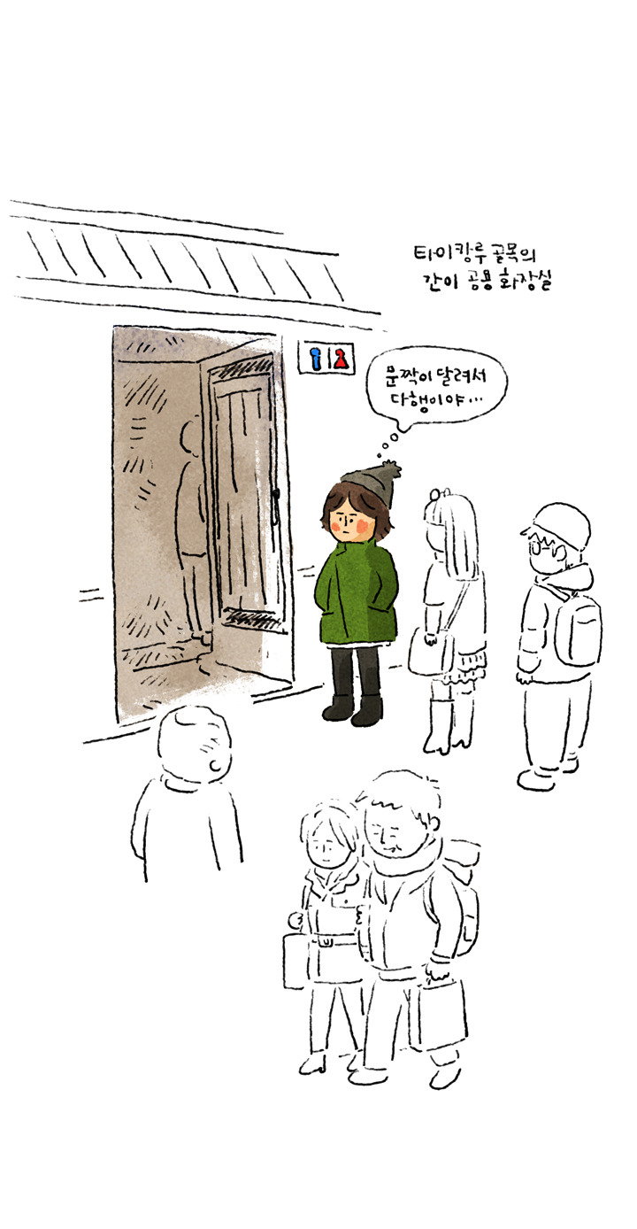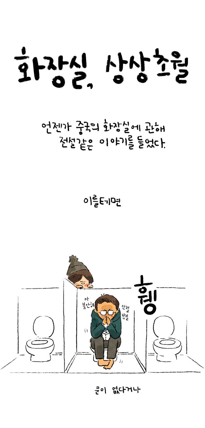 제 9의 기분은 충격이다 그리오. 이곳 화장실, 앞 사람 옆 사람… 문화충격이라 하오.