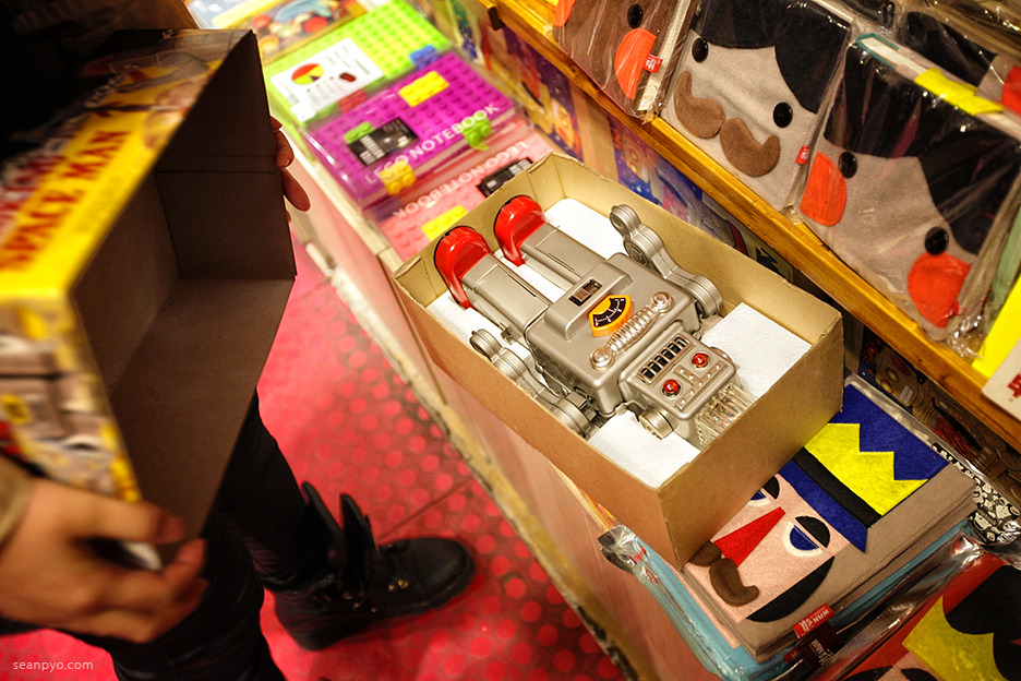 하나하나 꼼꼼히 살피고 제대로 작동이 되는지도 움직여보았다. 점원에게 부탁해서 건전지를 뺐다 넣었다 하며 두개의 로봇중 하나를 고르지 못해 시간을 끌다가 선택한 로봇은 '스모킹 스페이스맨'이다.