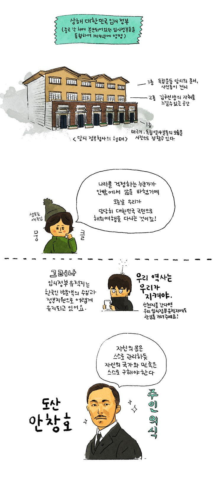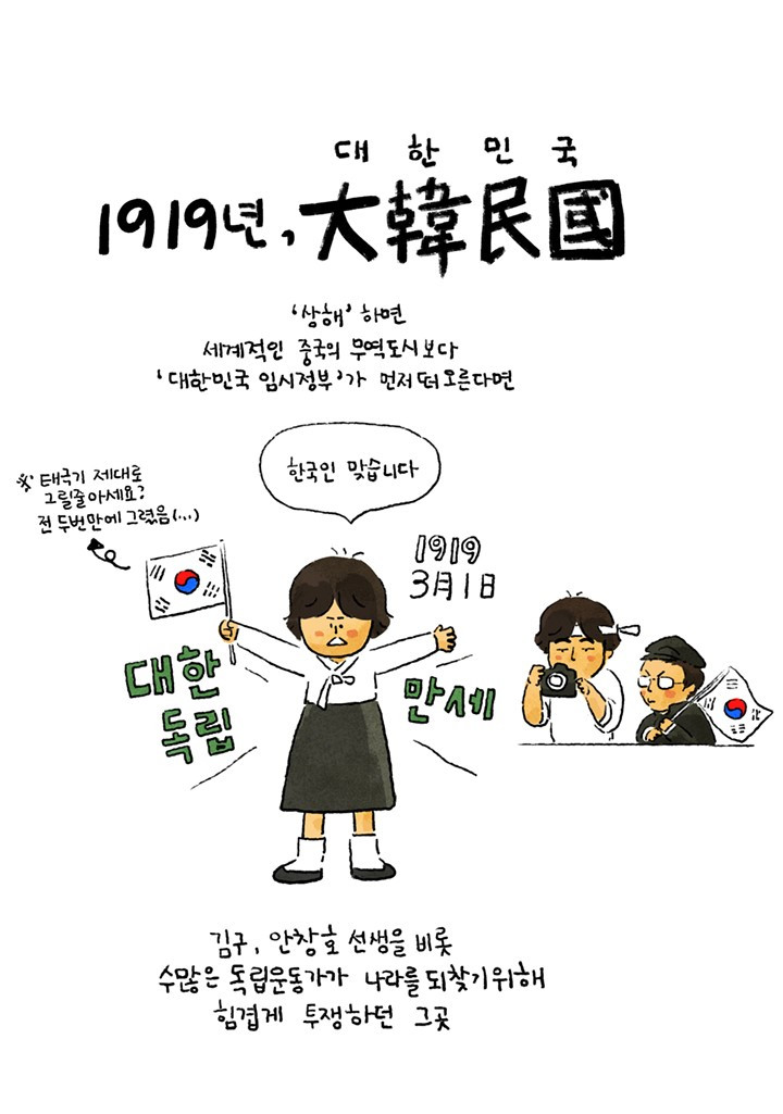 1919년, 빼앗긴 나라를 되찾기 위해 뜨겁게 한 생을 살아갔던 분들을 떠올리며, 헤매고 쫓겨 뜻을 제대로 품지도 펼치지도 못하는 지금 대한민국의 여러 삶에 대해 생각하게 됐다. 우리의 치열함은 어디로 가고 있는 것일까? 무엇이 의미 있는 삶일까? 이런 생각, 쓸데없는 것일까? 어쨌든 대한민국임시정부에서 힘겨운 투쟁을 이어갔던 모든 분들께 감사한 마음이 들었다.