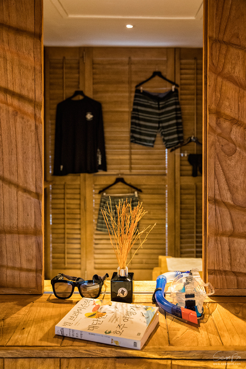 실내는 바다를 향해 커다란 창이 나 있어 침대에 누워서도 시원하게 바다를 바라볼 수 있는 구조다. 커튼은 사생활을 보호할 수 있는 얇은 커튼과 암막 커튼, 이중으로 되어있다. 실내의 조도가 높은 편은 아니었으나 창이 커서 지내는 내내 시원한 개방감을 느낄 수 있었다.