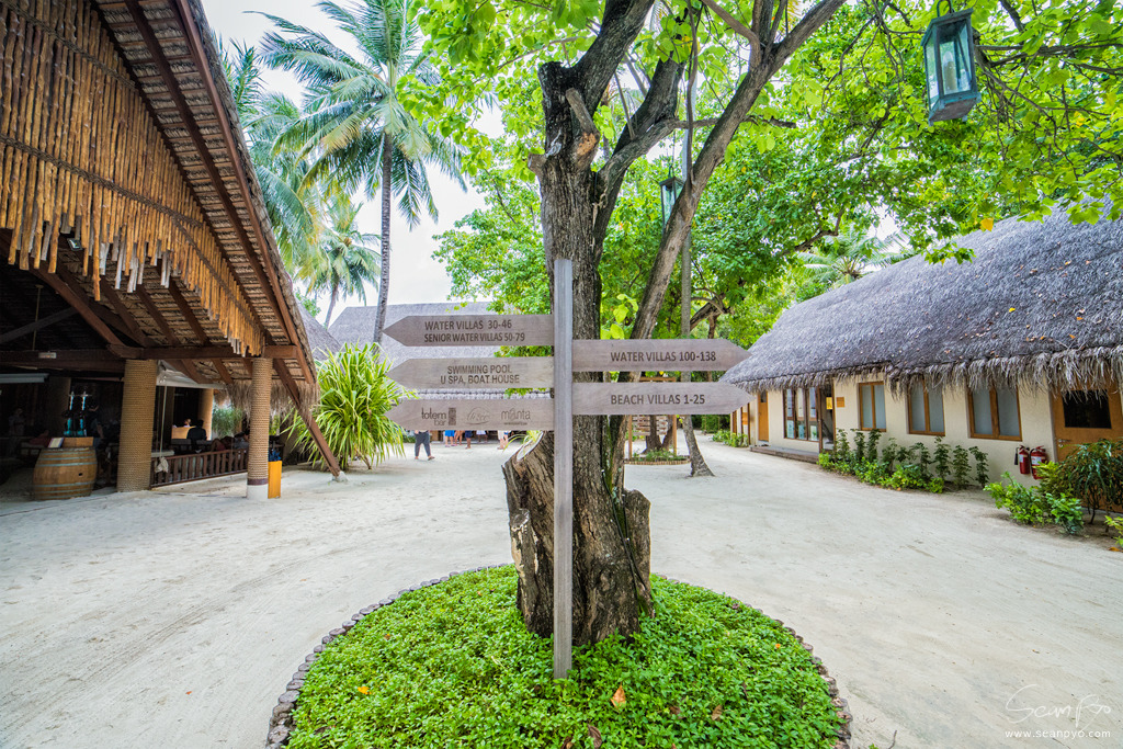 비행기가 내려앉은 선착장에서 긴 제티를 건너 섬으로 들어오면 오른편에는 방문자를 위한 리셉션이, 왼편에는 만타 바(manta bar)가 있다. 그리고 길을 가로막은 이정표가 눈으로 확인되지 않는 시설에 대한 대략의 방향을 알려준다.