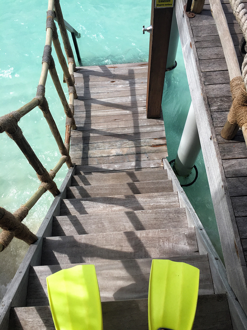 워터빌라의 계단 바로 아래, 무릎을 살짝 올라오는 낮은 수심부터 산호와 열대어가 가득했다.