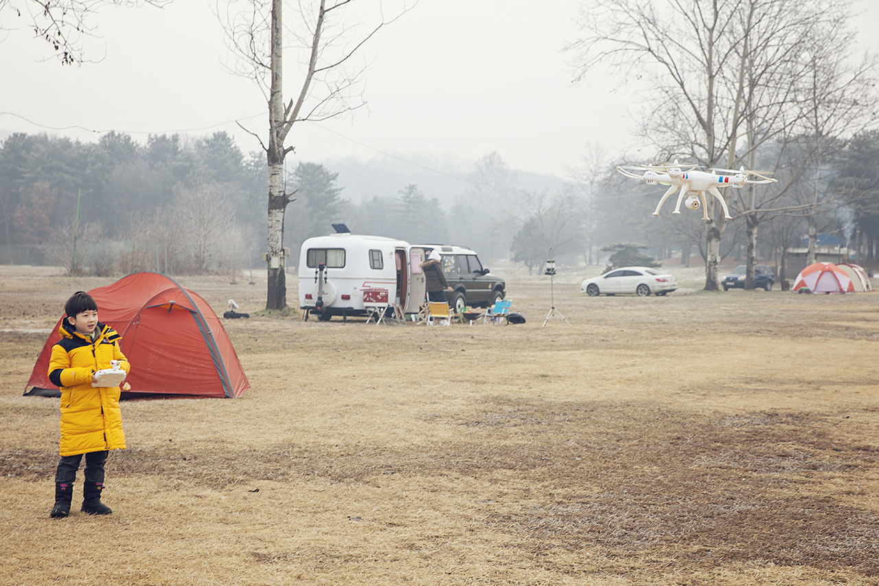 아이는 너른 마당에서 드론을 날린다. 서울에서는 드론을 가지고 놀 공간이 마땅치 않다.