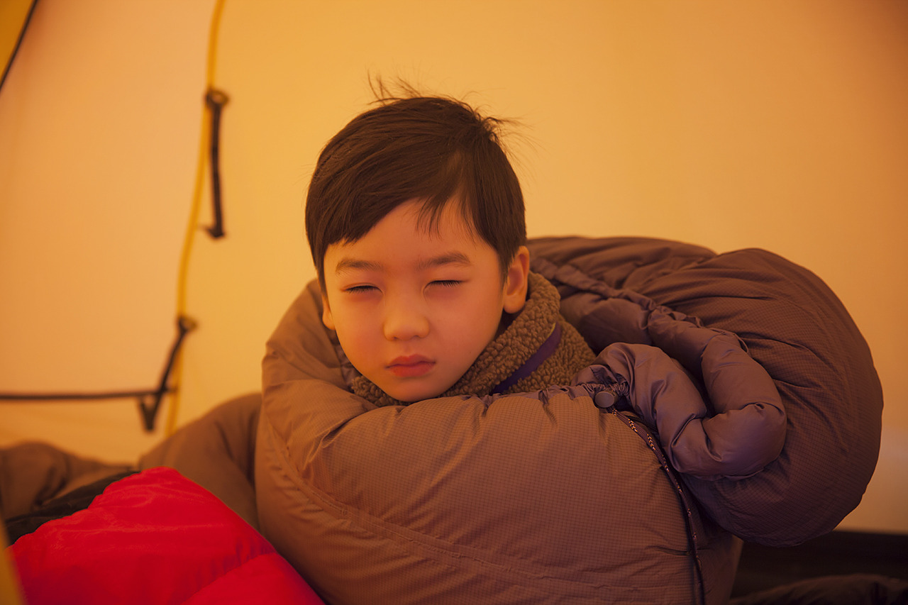 새해 첫날 아침 텐트에서 잠이 깬 아이...