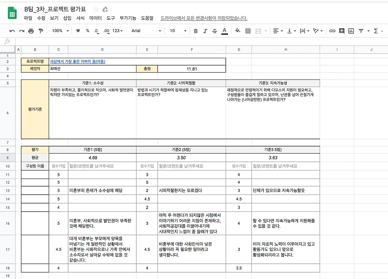 토론이 끝나고 나면 각 투자 결정 기준에 따라 모든 계주들이 5점 척도로 점수를 반영해 평가합니다. 모든 구성원들이 서로의 의견과 점수를 확인할 수 있도록 점수 평가 시트는 모두 공개됩니다.