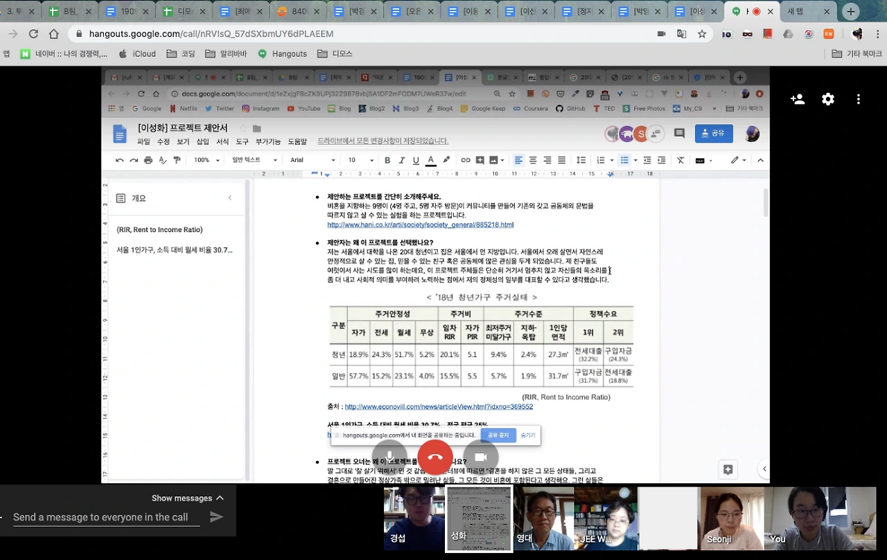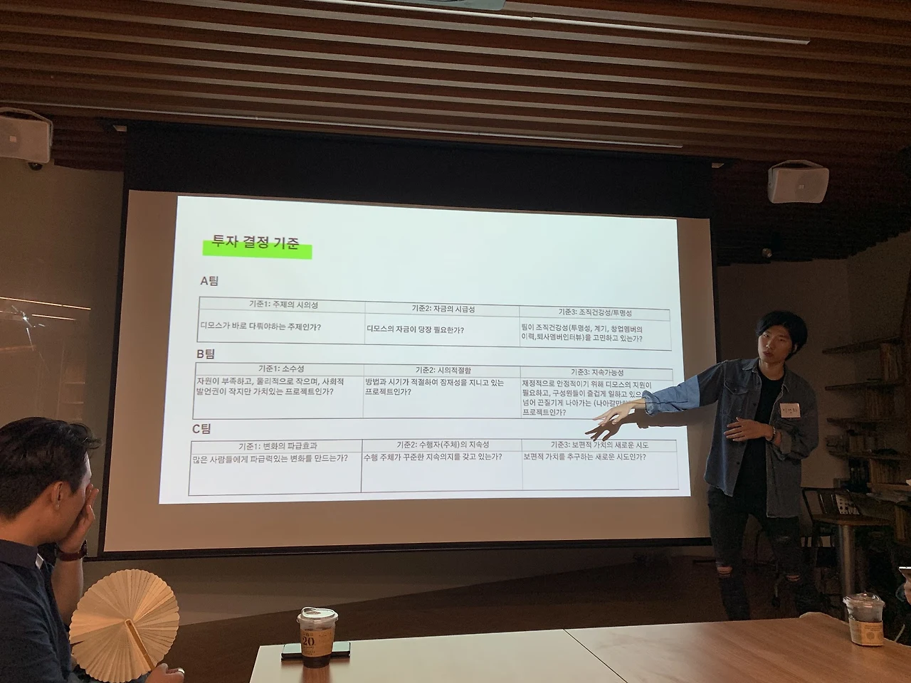 2019년 계모임은 9월, 태풍이 심한 어느 날 오프라인 모임을 취소하고 각자 편한 자리에서 온라인으로 만나 프로젝트를 제안하고 충분히 토론하는 시간을 가졌습니다. 각 투자 기준에 어떻게 부합하고 어떤 점이 더 필요할지에 대해 토론합니다.