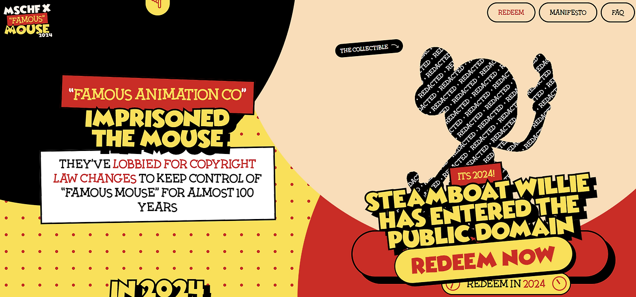 예술가 집단 ‘미스치프’는 3년 전에 이와 관련한 재미난 프로젝트를 기획하기도 했습니다. Famous Mouse라는 프로젝트이고요. 미키마우스 저작권이 소멸되는 2024년이 됐을 때, 미키마우스 작품 ‘Famous Mouse’와 교환할 수 있는 토큰을 판매하는 프로젝트입니다. 토큰을 샀던 사람은, 이제 작품과 교환할 수 있겠네요. 이 프로젝트는, 디즈니의 과도한 저작권 독점을 비꼬는 취지가 담겨있었다고 합니다.