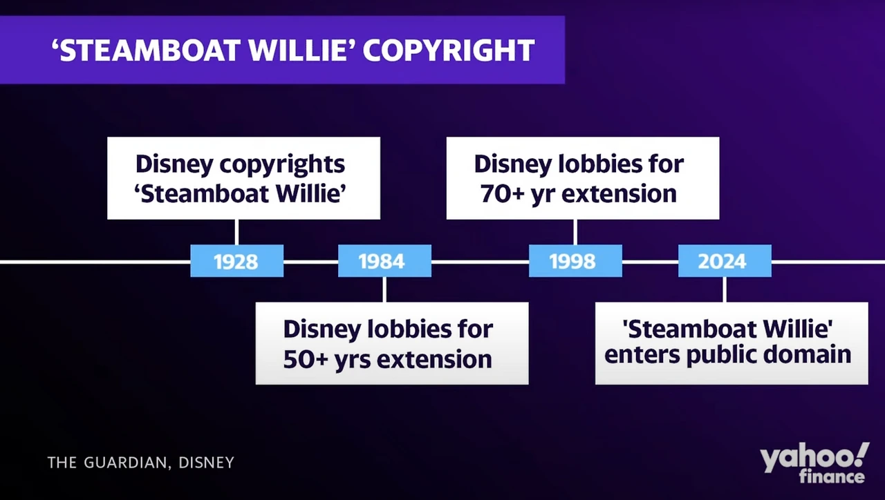 살펴보니, 원래 증기선 윌리(steamboat willie) 미키마우스는, 1984년에 이미 공개 도매인으로 변경되었어야 했다고 합니다. 하지만 디즈니가 의회에 여러 차례 로비를 해서(미국은 로비가 합법), 40년이나 저작권을 연장하는 데 성공했다고 하네요.