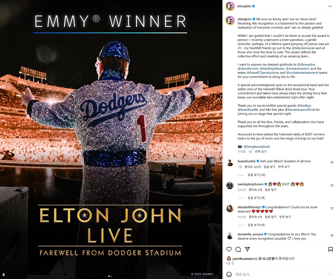 엘튼존이 수상한 작품은 LA다저스 홈구장에서 진행한 콘서트 라이브 버전인, ‘엘튼존 라이브:페어웰 프롬 다저 스타디움’이라고 하네요. 작품은 디즈니플러스에서 보실 수 있습니다.