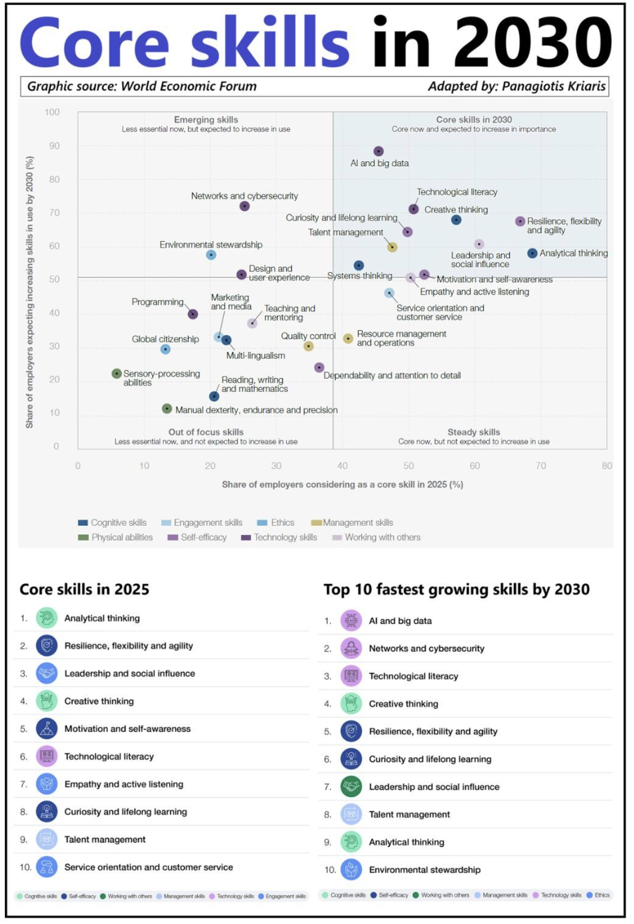 세계경제포럼(World Economic Forum)의 Future of Jobs Report 2025에서 발췌한 한 이미지를 보게 됐습니다. Panagiotis Kriaris라는 분석가가 재구성한 ‘Core Skills in 2030’이라는 그래프입니다.
