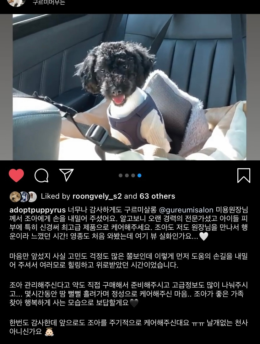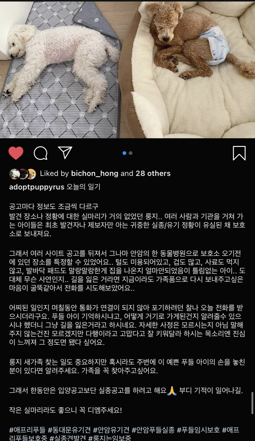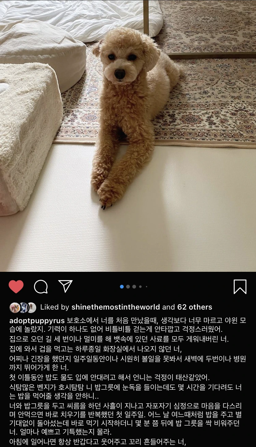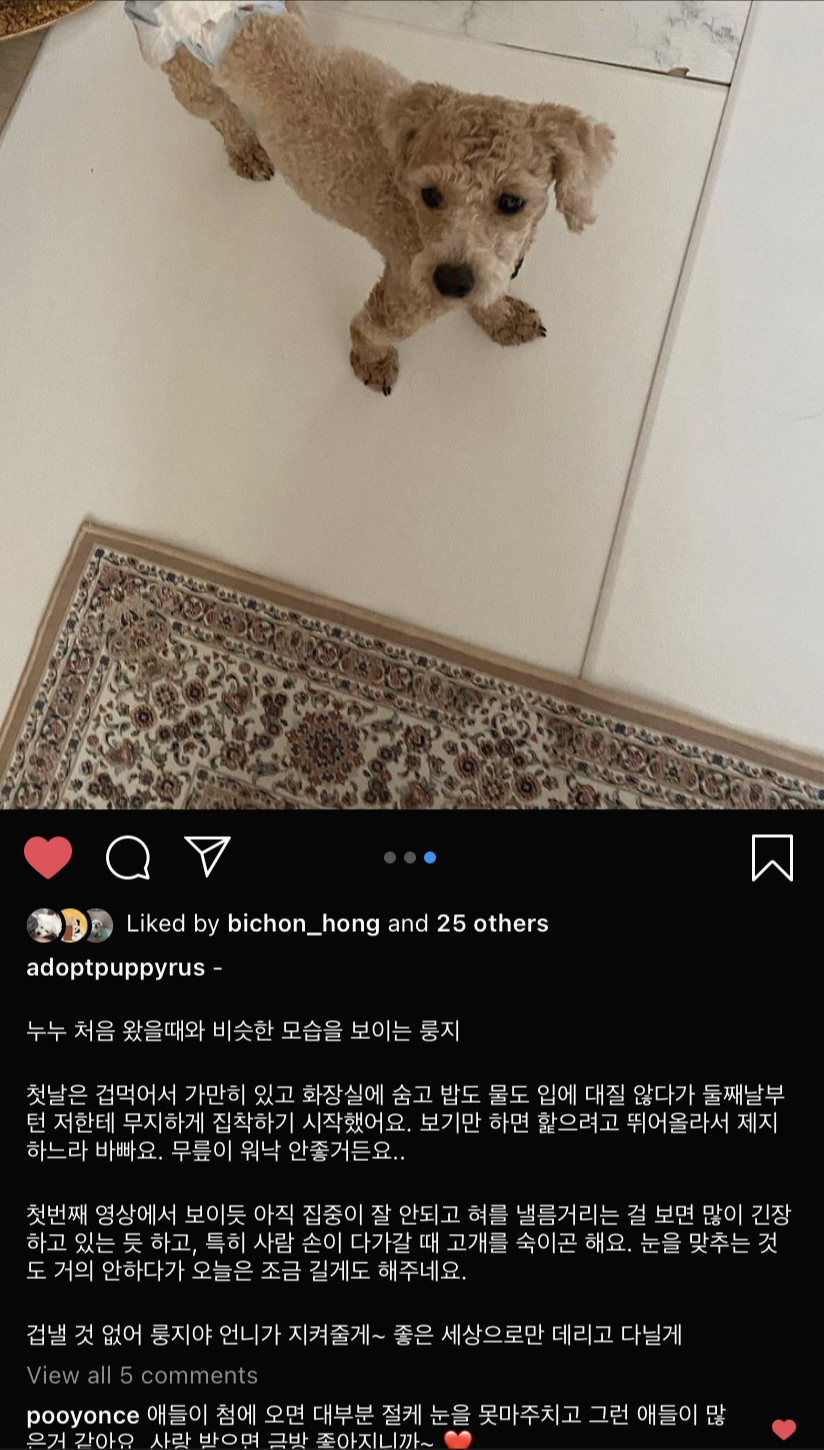 절차를 밟아 입양신청을 하시면 수 일 내에 연락이 올거에요. 공고기간을 넘긴 아이들이 지금 이시간에도 더위나 추위, 외로움, 두려움과 싸우며 질병의 위험에 노출되어 두려움에 떨며 철창 속에 갇혀있어요. 룽지처럼 겁많은 아이들에게는 하루하루가 십년같이 길고 아플거에요. 내 아이가 거기 있다고 생각하시고 유기동물 정보시스템 (앱이나 웹) 이나 인스타 피드를 눈여겨 봐주세요. 일분 일초가 다급하고 간절한 생명들이 많습니다. 내 발걸음 한 번에 ‘유기견’이 내 아이가 됩니다. 조금만 집에서 생활하고 씻고 때 빼면 예뻐져요. 룽지가 변하는데 두 달도 안 걸렸듯이.. 이전에 임보했던 아이들 보면, 길어야 한 달, 짧으면 몇 주 안에도 집 강아지 돼요. 견생 15년이 두 달 사이에 바뀔 수 있는거에요. 큰 변화에 비하면 아주 작은 노력이죠.