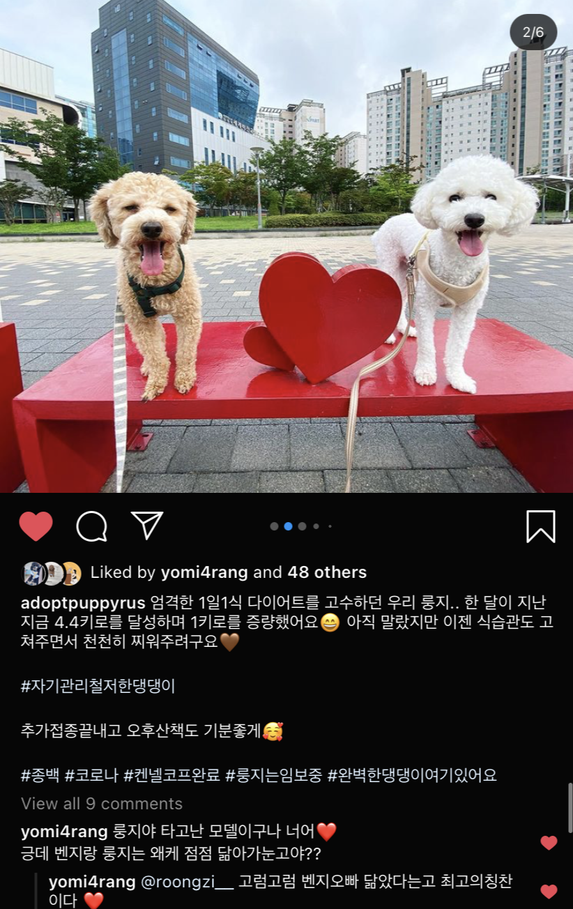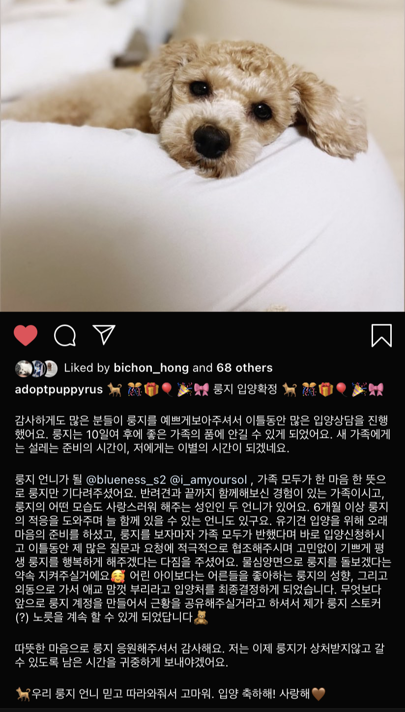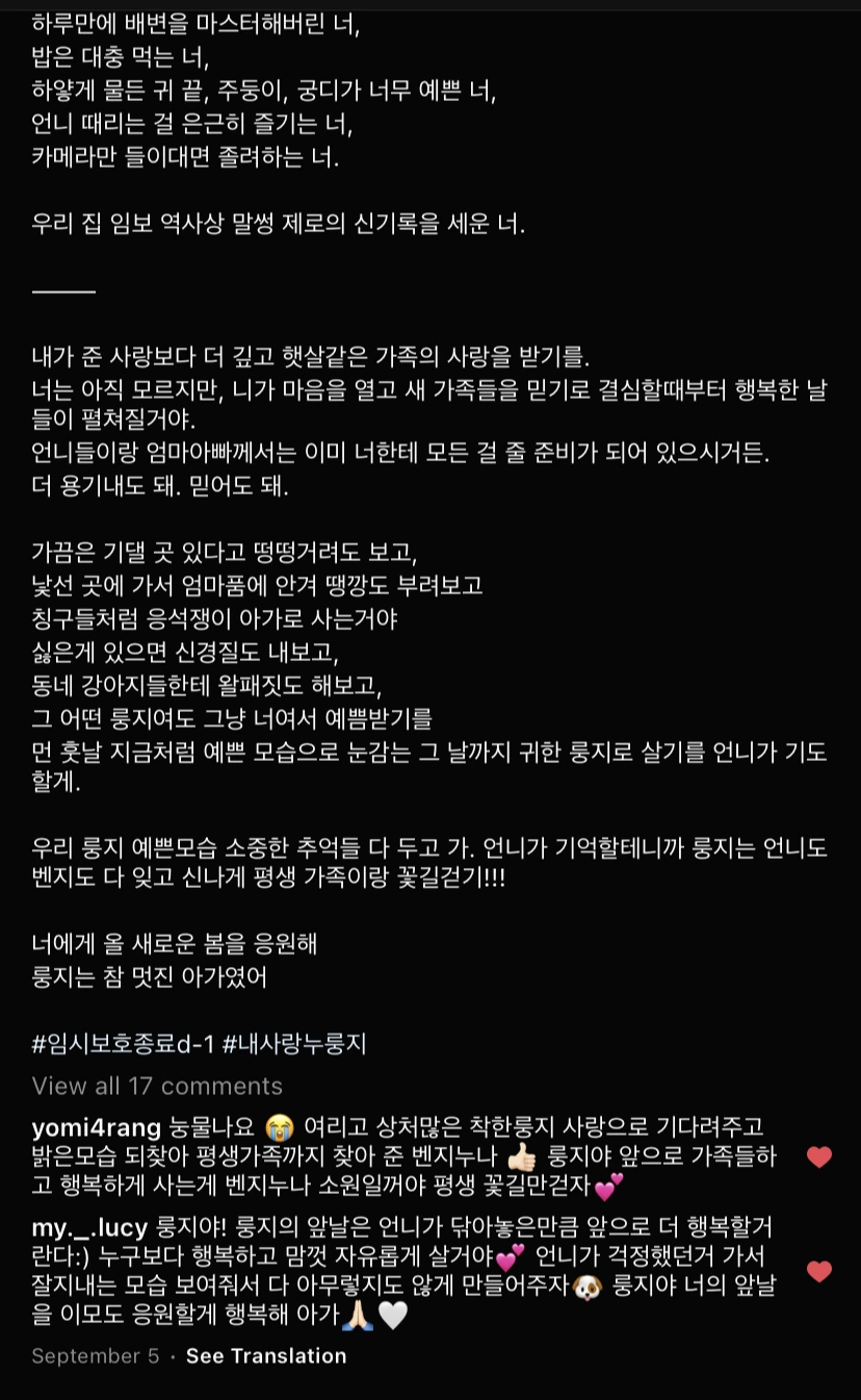 인형같이 귀엽고 예쁜 모습만 보고 누리길 원하는 분들은 그냥 유튜브 보세요. 반려견은 당신을 위로하기 위해 존재하는 애교머신이 아닙니다. 입양 전에는 내가 정말 이 아이를 위해서 입양을 원하는 것인가 아니면 내 행복이 먼저인가 하는 질문을 스스로에게 꼭 던져보세요. 이 아이의 건강과 행복을 위해 나의 귀중한 시간, 취미 생활, 돈, 또는 내가 아끼는 무언가를 잃어도 정말 괜찮을지를요. 괜찮지 않다면 나를 위해 하는 입양입니다. 유기견은 그런 입양자들에게서 생깁니다. 저도 저 자신을 돌아보면 아직 한참 부족하고 룽지에게도, 벤지에게도 미안한 일들이 많았어요. 제가 보호했던 아이들 하나하나 보낼 때마다 아프지만 저보다 훨씬 더 많은 것들을 줄 가족의 품으로 가기에 이별이 슬프지만은 않아요.