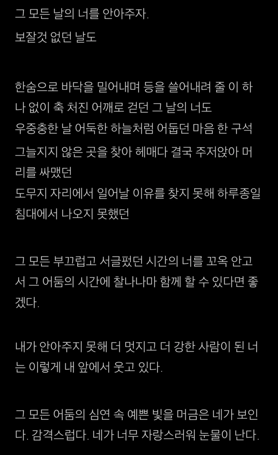 나는 사랑할 줄 아는 사람이라는 걸 온 몸으로 마음으로 느끼며 우리를 위한 희망으로 벅찼다.