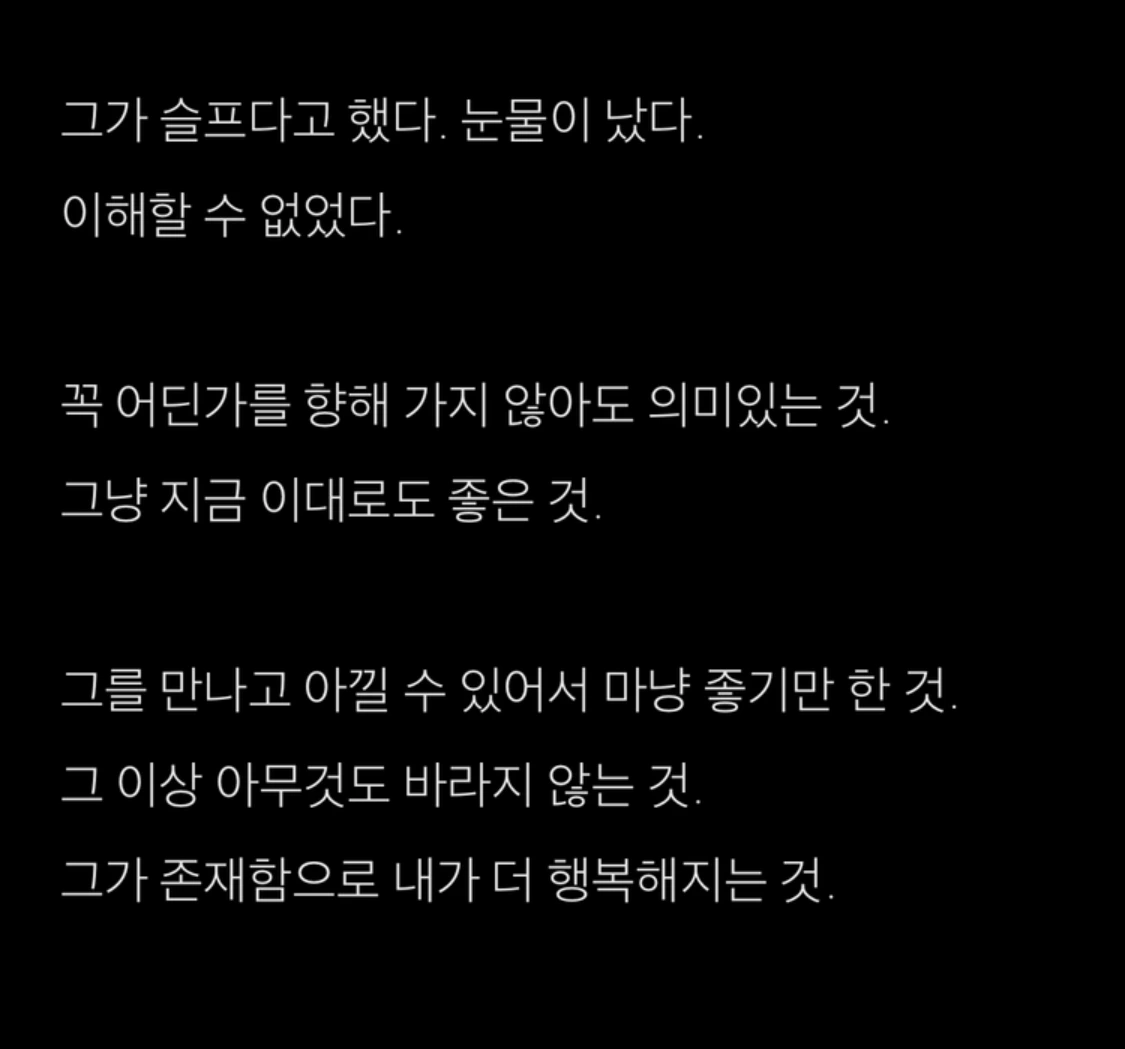 보고싶은 건 슬픈게 아니라 기쁜 것. 보고싶어할 사람이 있다는 것이 얼마나 행복한 일인지. 지금 내 곁에 없어 늘 그리워해야 한다는 것쯤은 아무것도 아닐 정도로 당신의 존재 그 자체로 황홀했다. 그걸로 됐다.