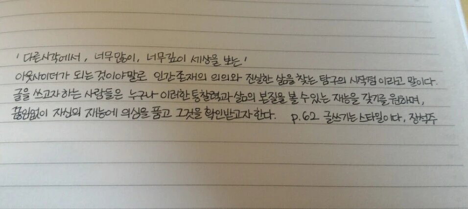 글을 쓰면서 느낀 점은, 글쓰기도 마찬가지라는 것이다. 글쓰기 또한 근원적으로 외로운 것이다. 글은 함께 쓸 수 없다. 완성되고 다듬어져 선보여지기 전까지는 공유할 수도 없다. 읽지 말지는 순전히 기회를 가진 자의 선택이고, 해석은 받아들이는 자의 몫이다. 정답은 없다. 저자에게 구해 묻지 않는 이상은 알 수도 없고 알 이유도 없다. 작가의 의도가 전부가 아니다. 궁극적으로 보면 글의 가치는 작가와 독자의 합동작품인 셈이지만, 글은 적어도 발행되기 전까지는 철저하게 작가의 눈물과 땀으로 점철된 외로움의 산물이다.
