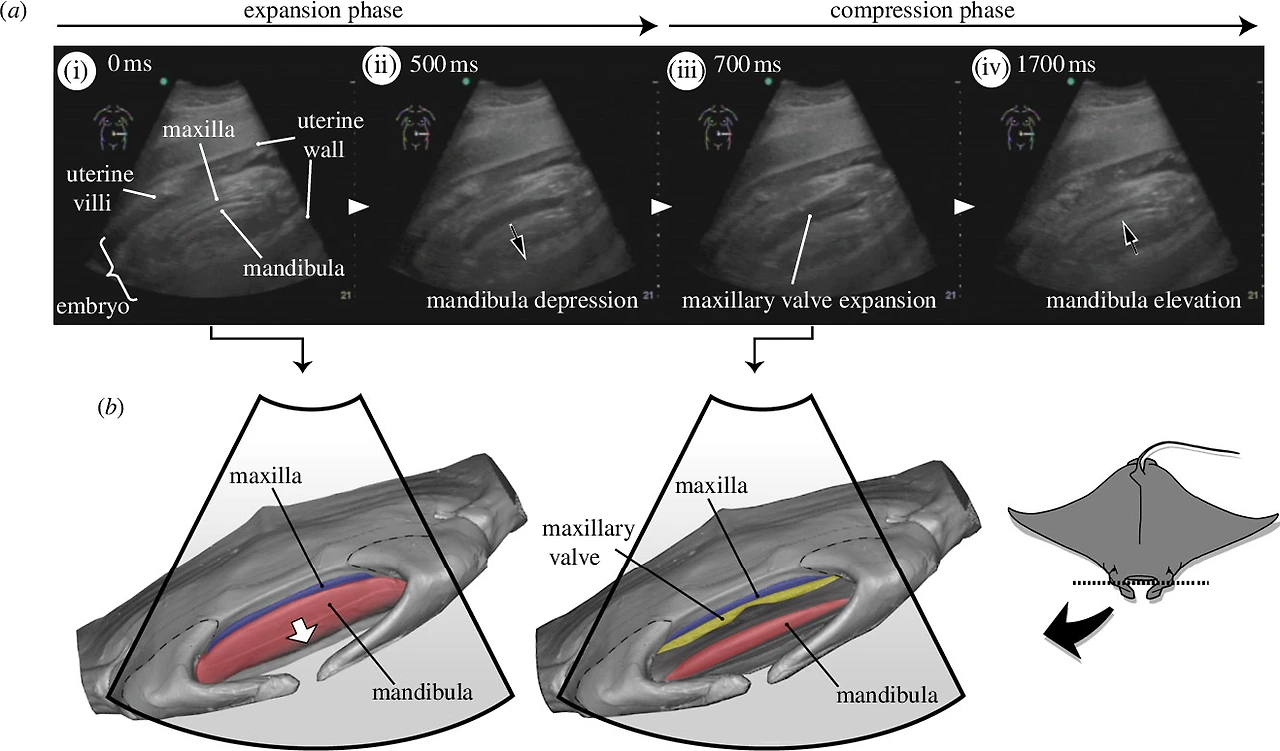 결론부터 말하자면, 쥐가오리의 태아는 자궁 내에서 호흡을 위해 “분수공”을 이용한다. 분수공을 이용하여 산소를 포함된 자궁액을 흡입하여 호흡에 이용하게 된다